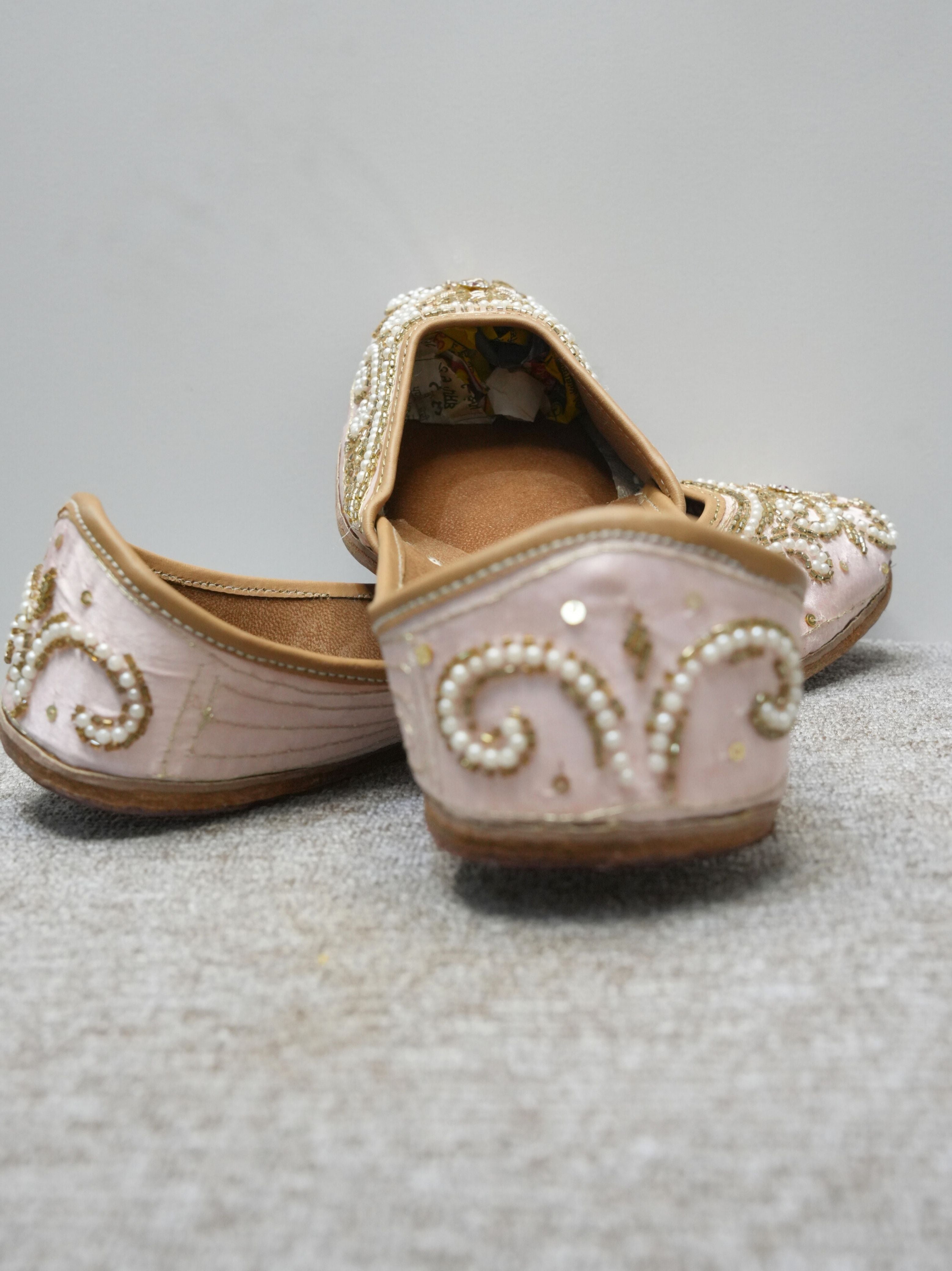 Design: Elaborate floral and vine motif embroidery on the toe and sides, meticulously hand-stitched with golden zari thread, beads, and central rhinestone accents.