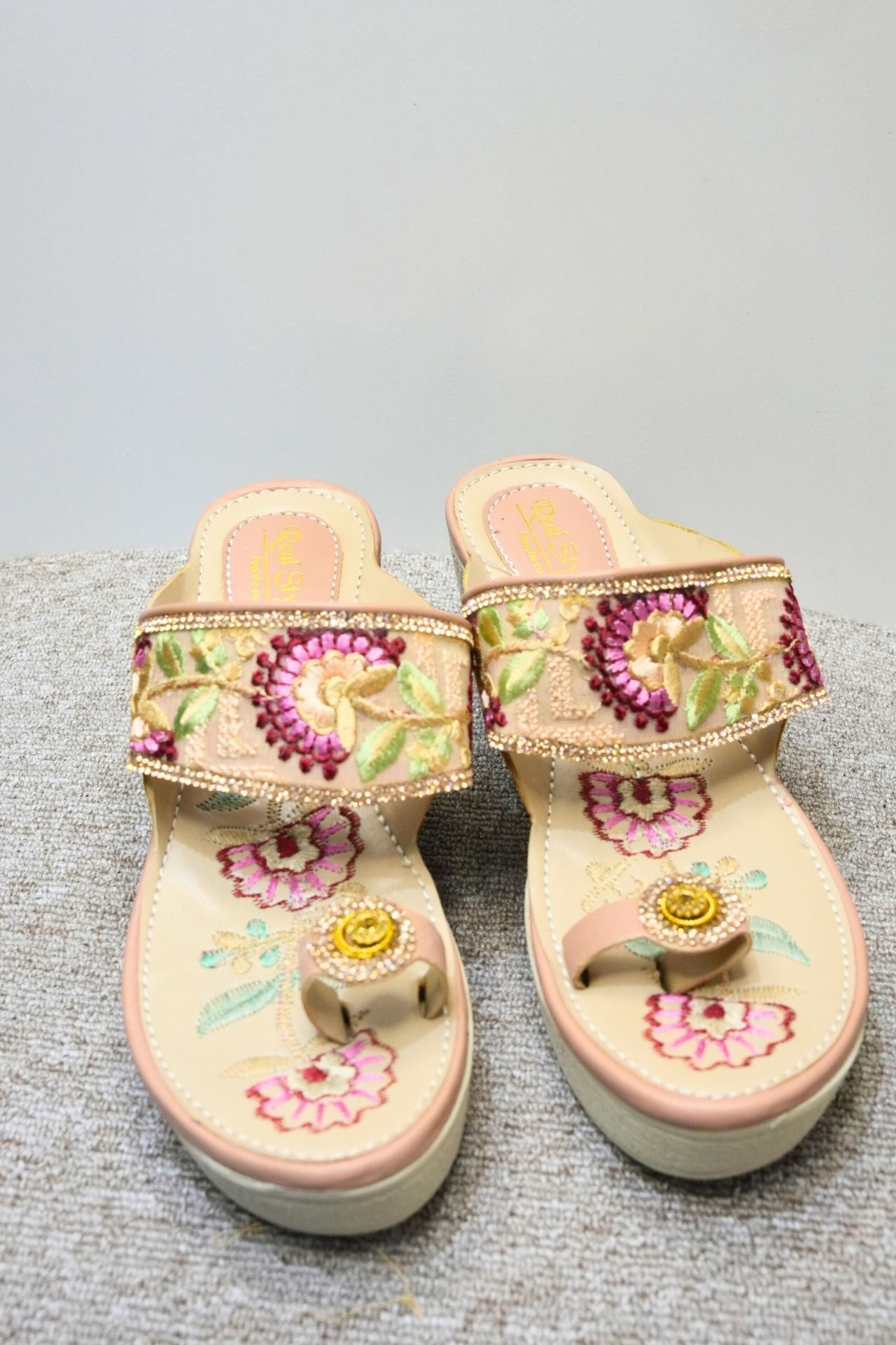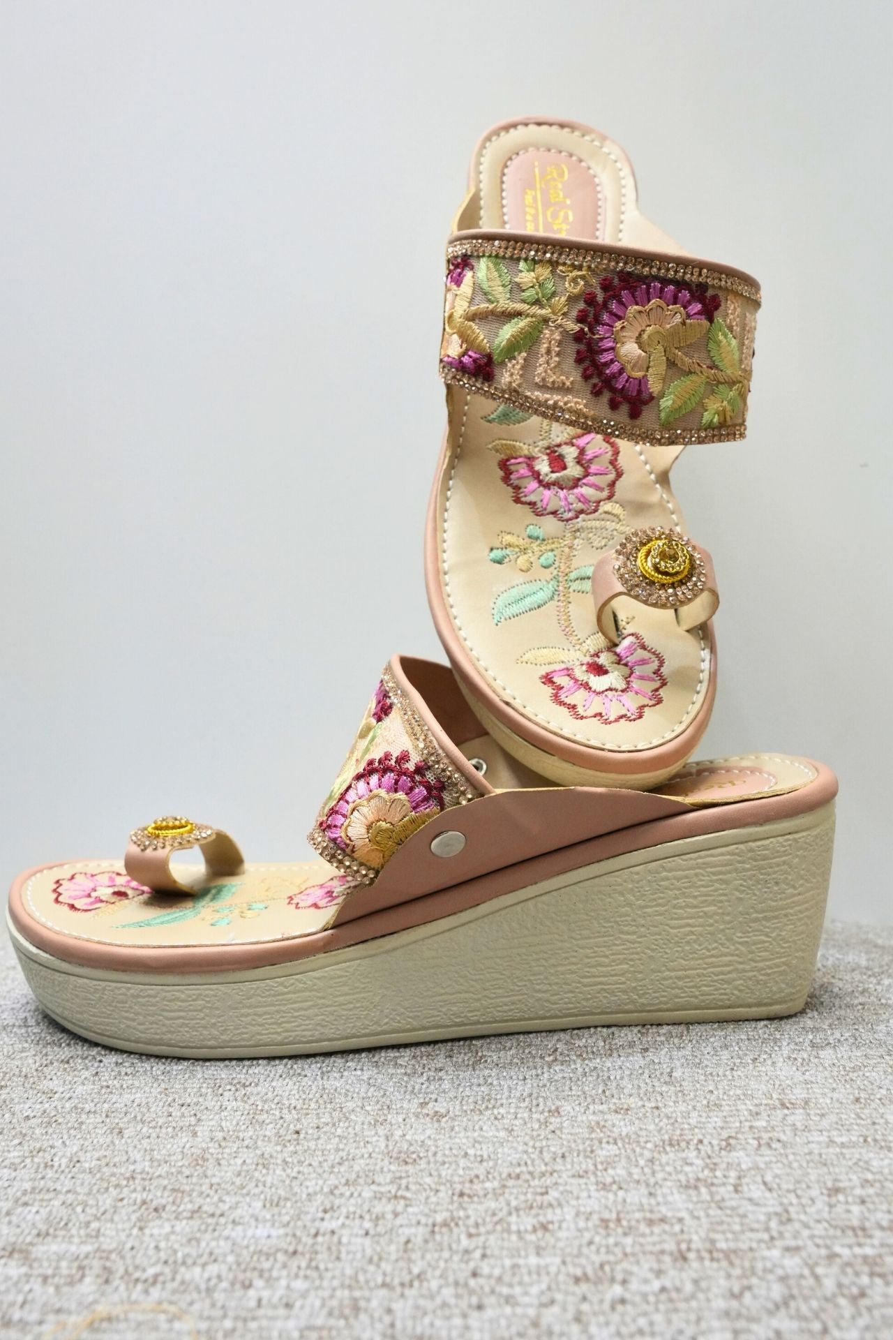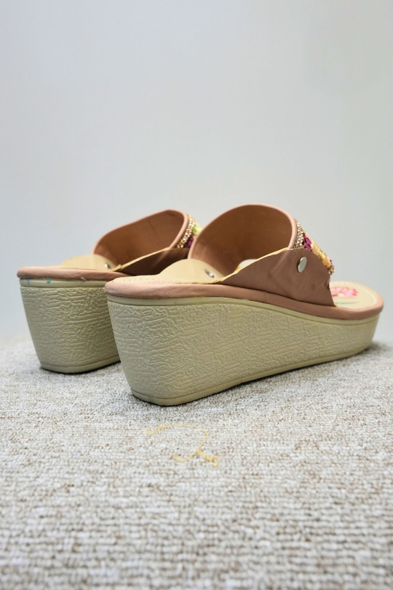 • Design: Open-toe slipper style with a broad forefoot strap and a delicate T-strap style toe holder. Features a slight wedge heel for lift.