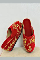 Red Velvet Platform Juttis with Hand-Embroidered Floral Sprigs