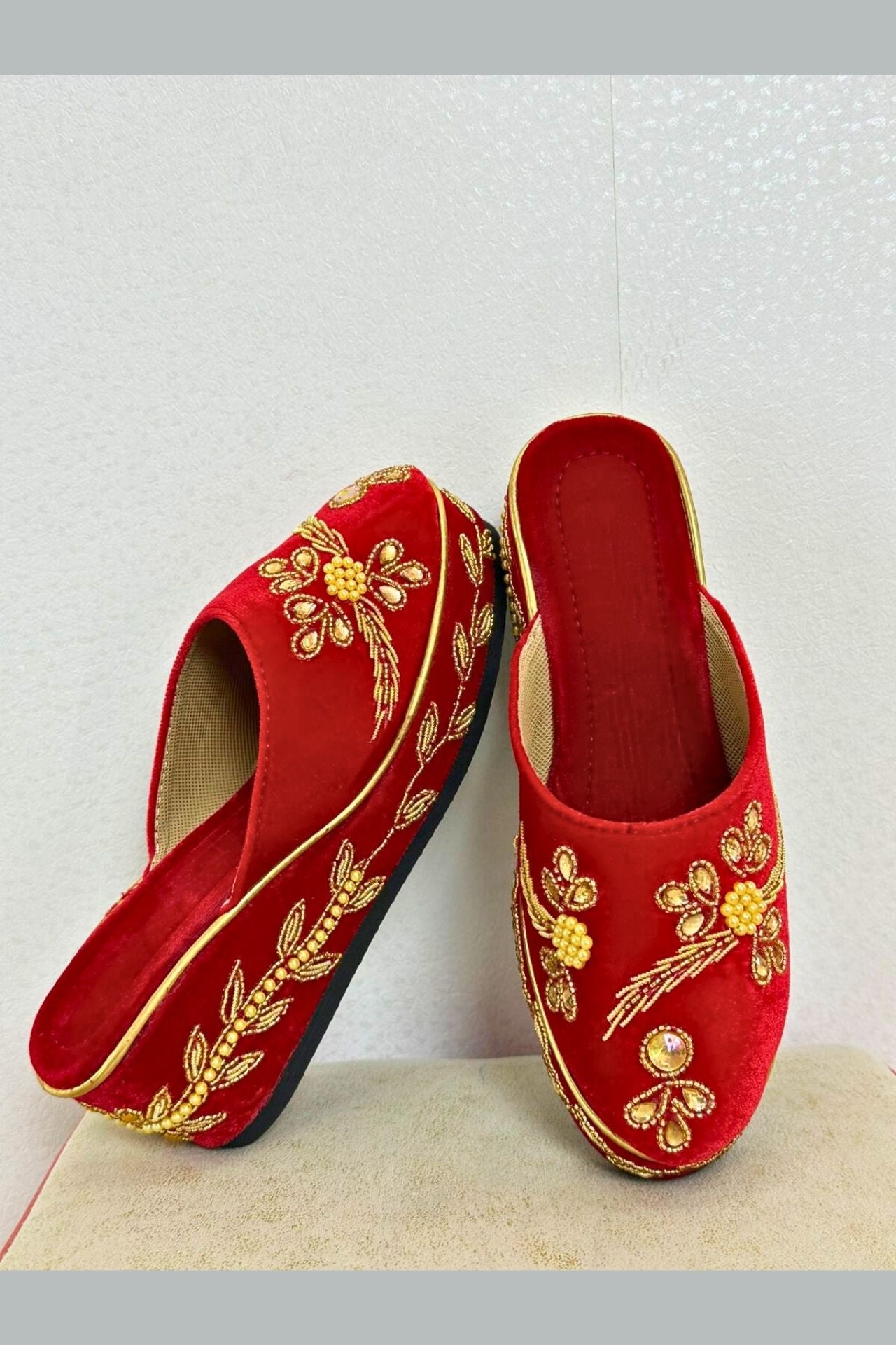 - Indulge in the stunning beauty of Behuli/ Red Bridal velvet Shoes - the perfect choice for your special day.