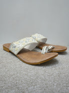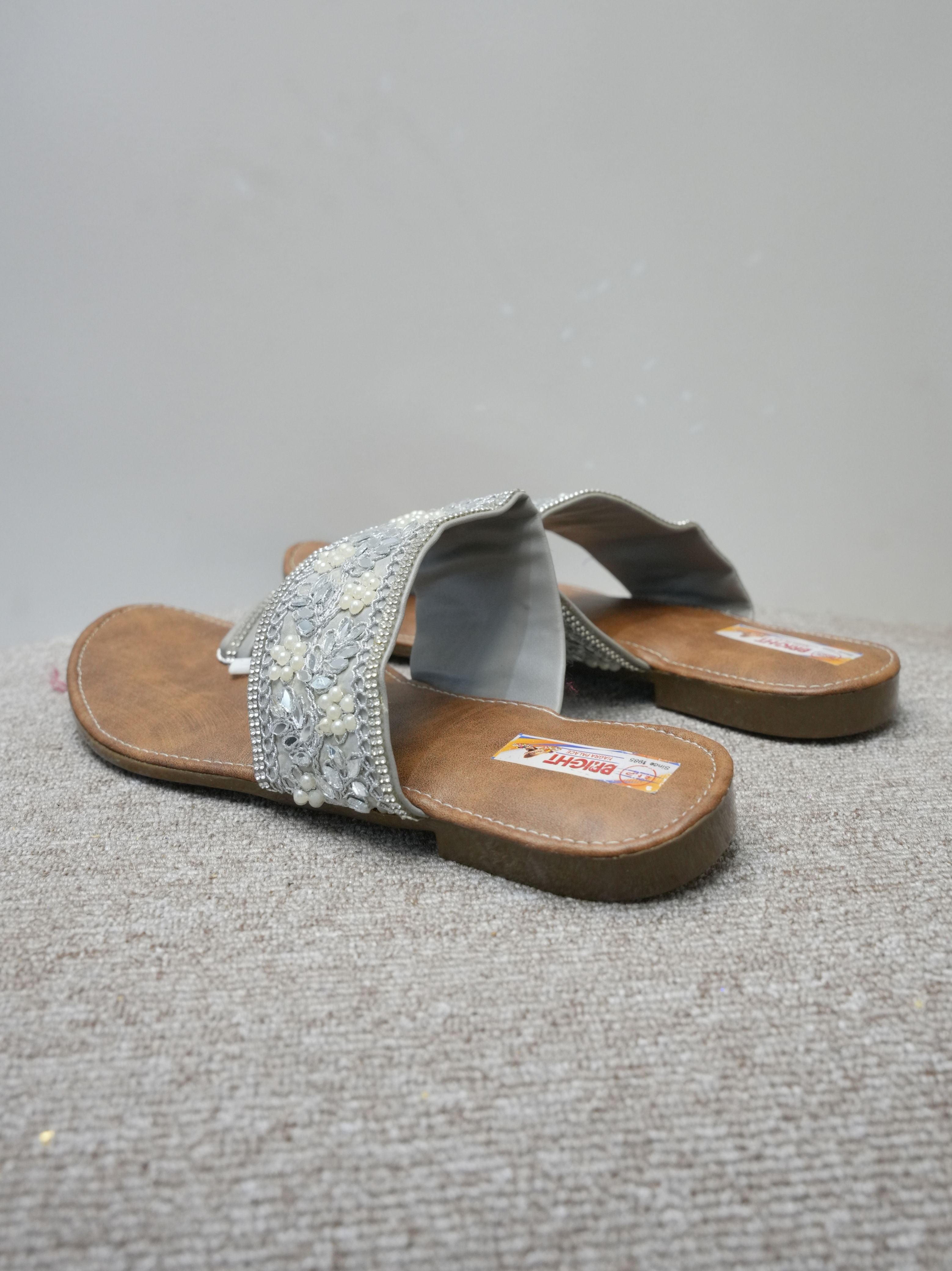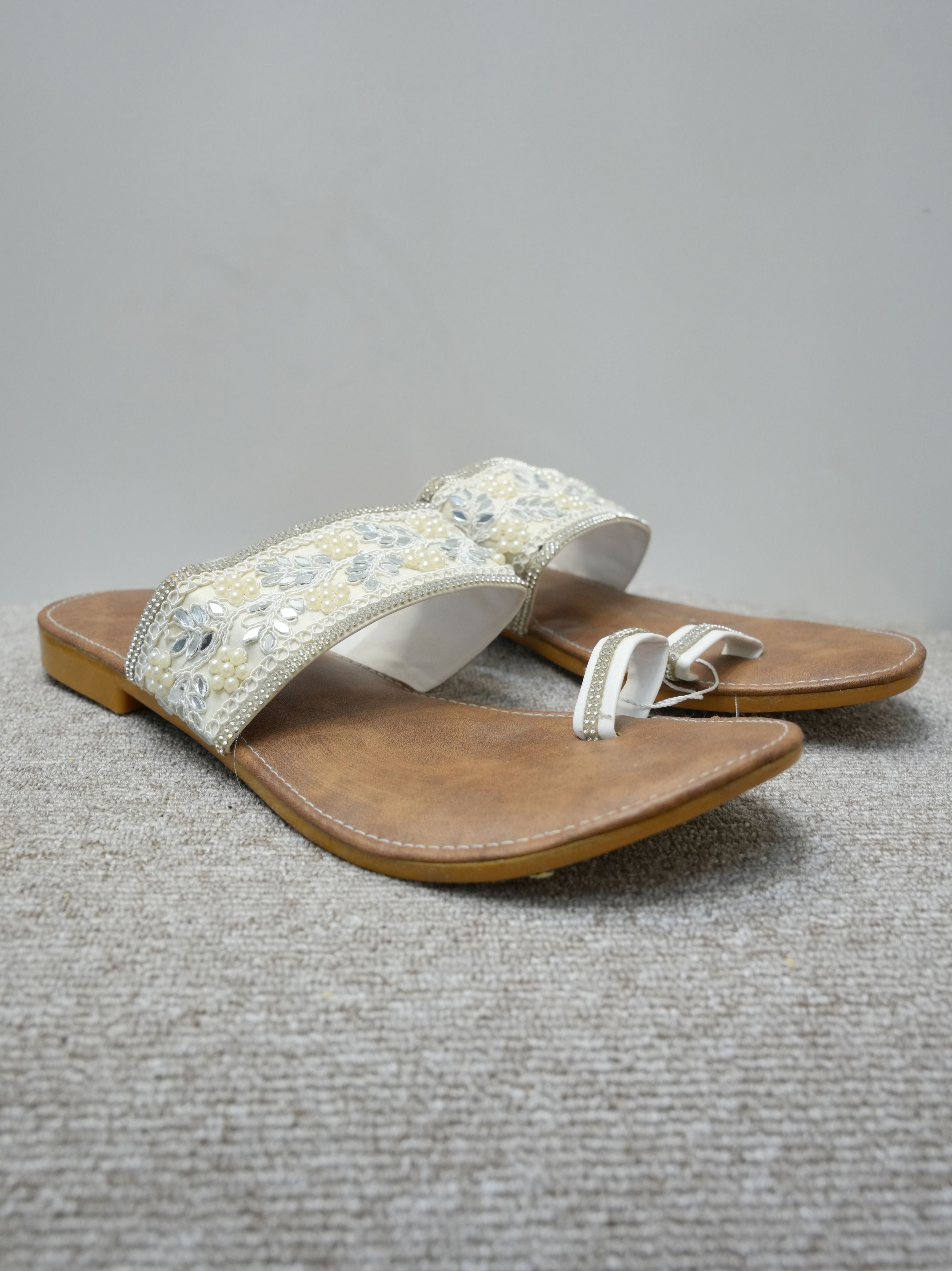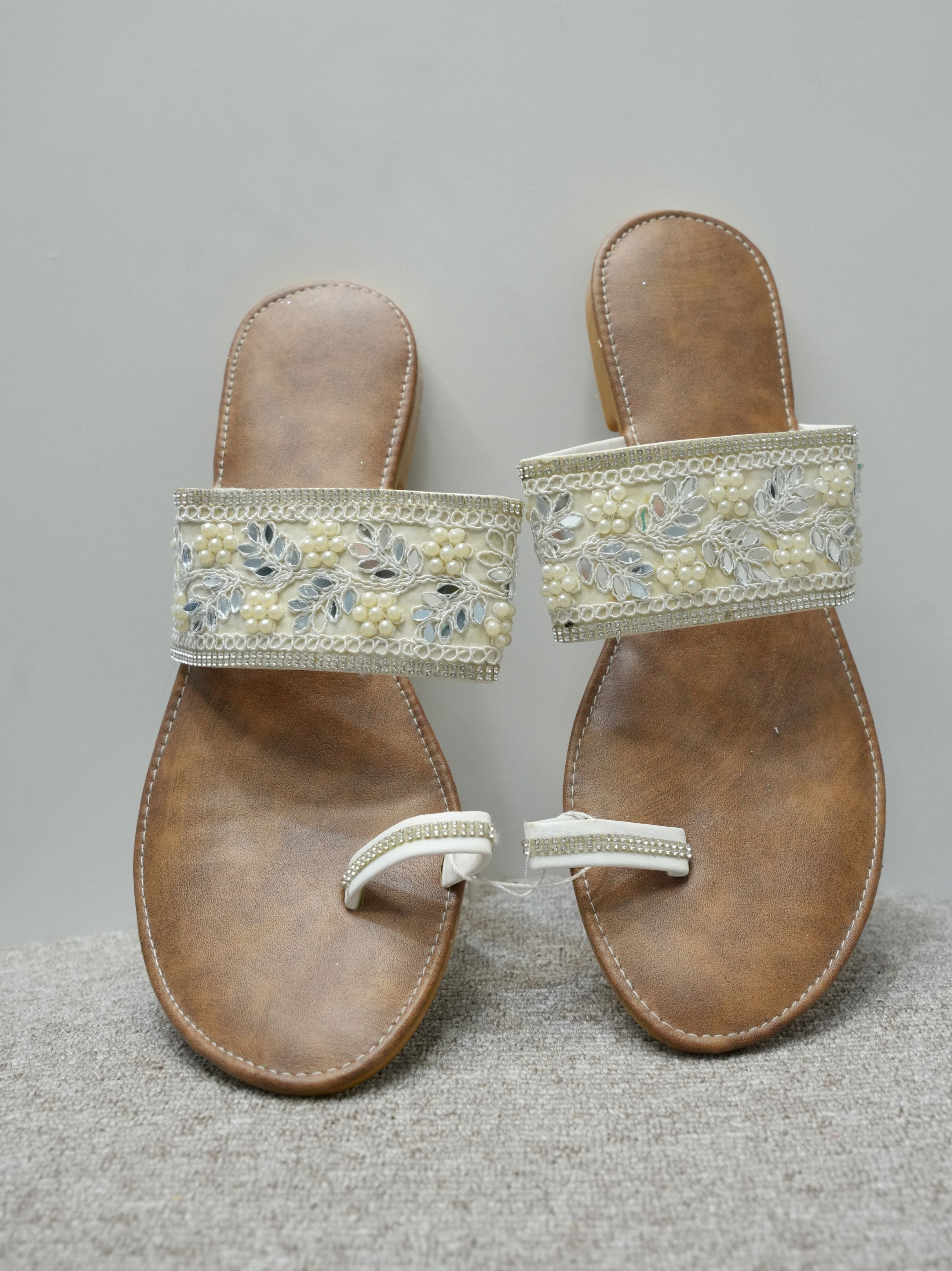 Design: Elaborate floral and vine motif embroidery on the toe and sides, meticulously hand-stitched with golden zari thread, beads, and central rhinestone accents.