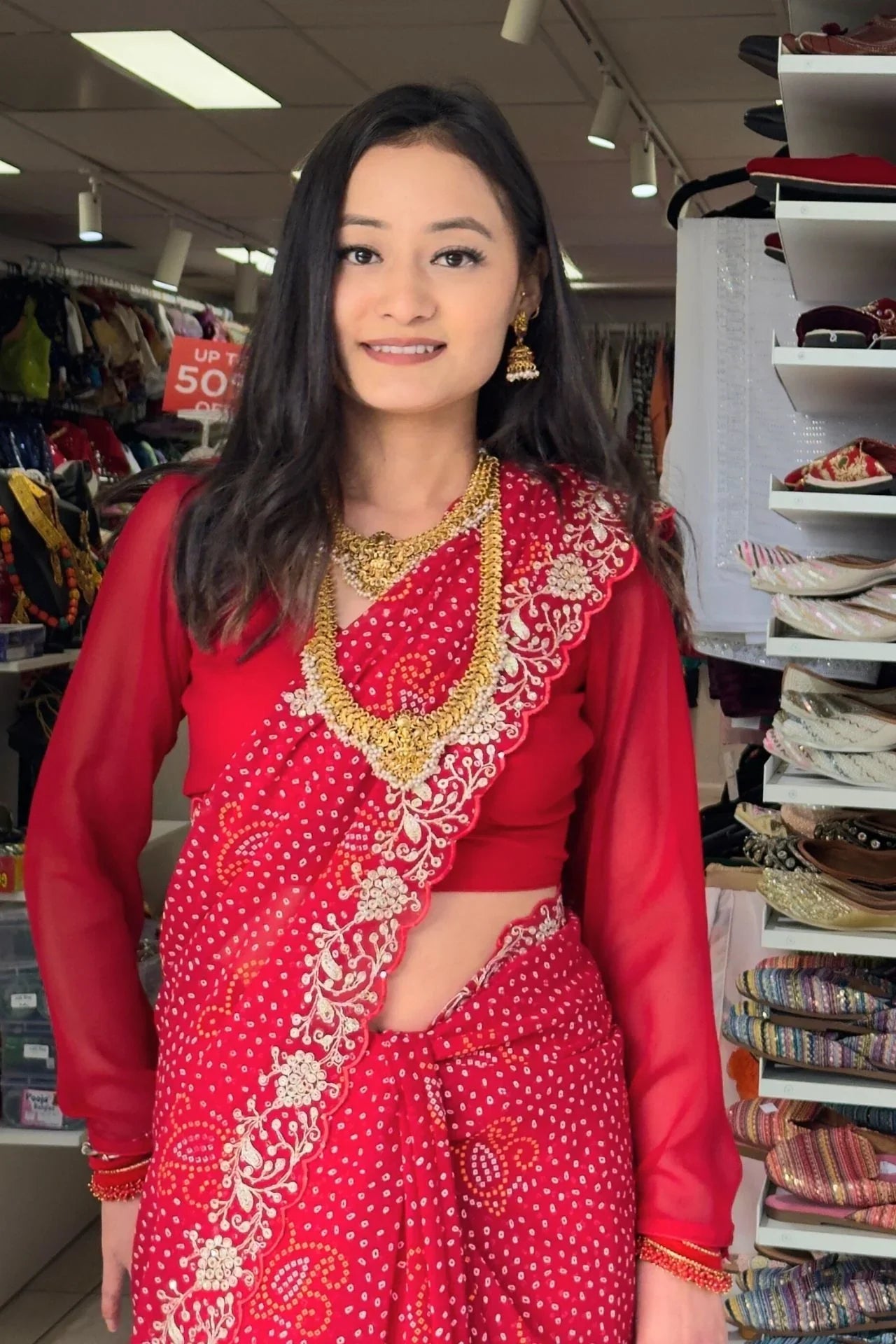 Red Chiffon Bandhani Printed Saree With Embroidery Broder