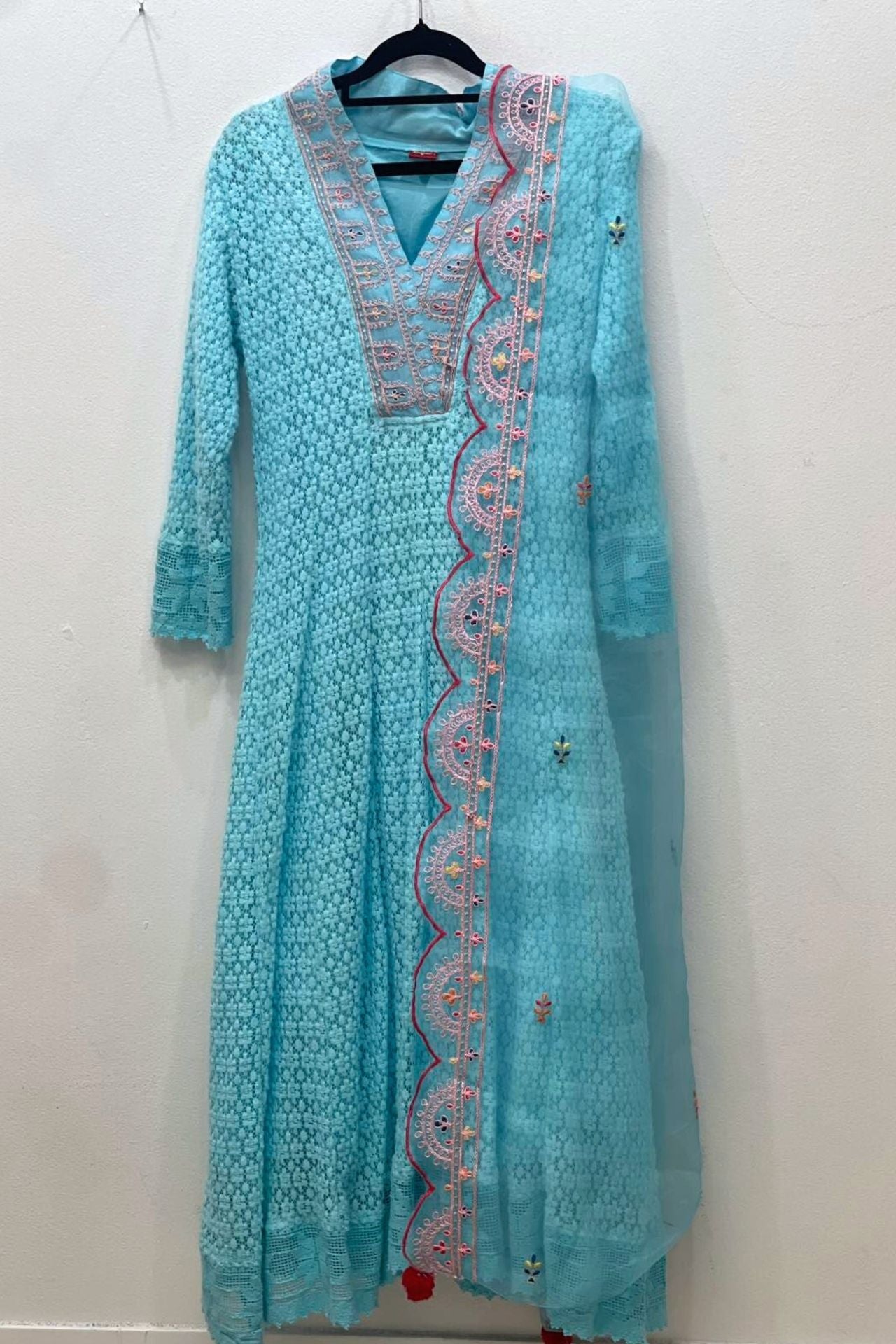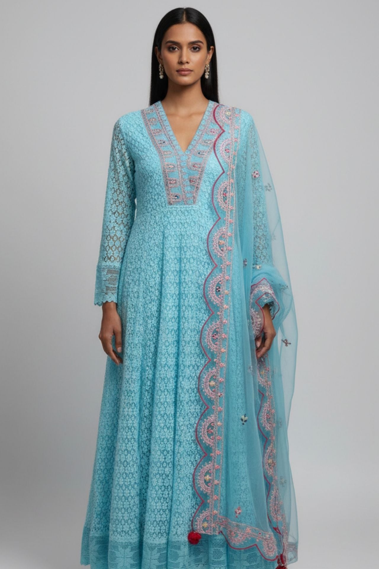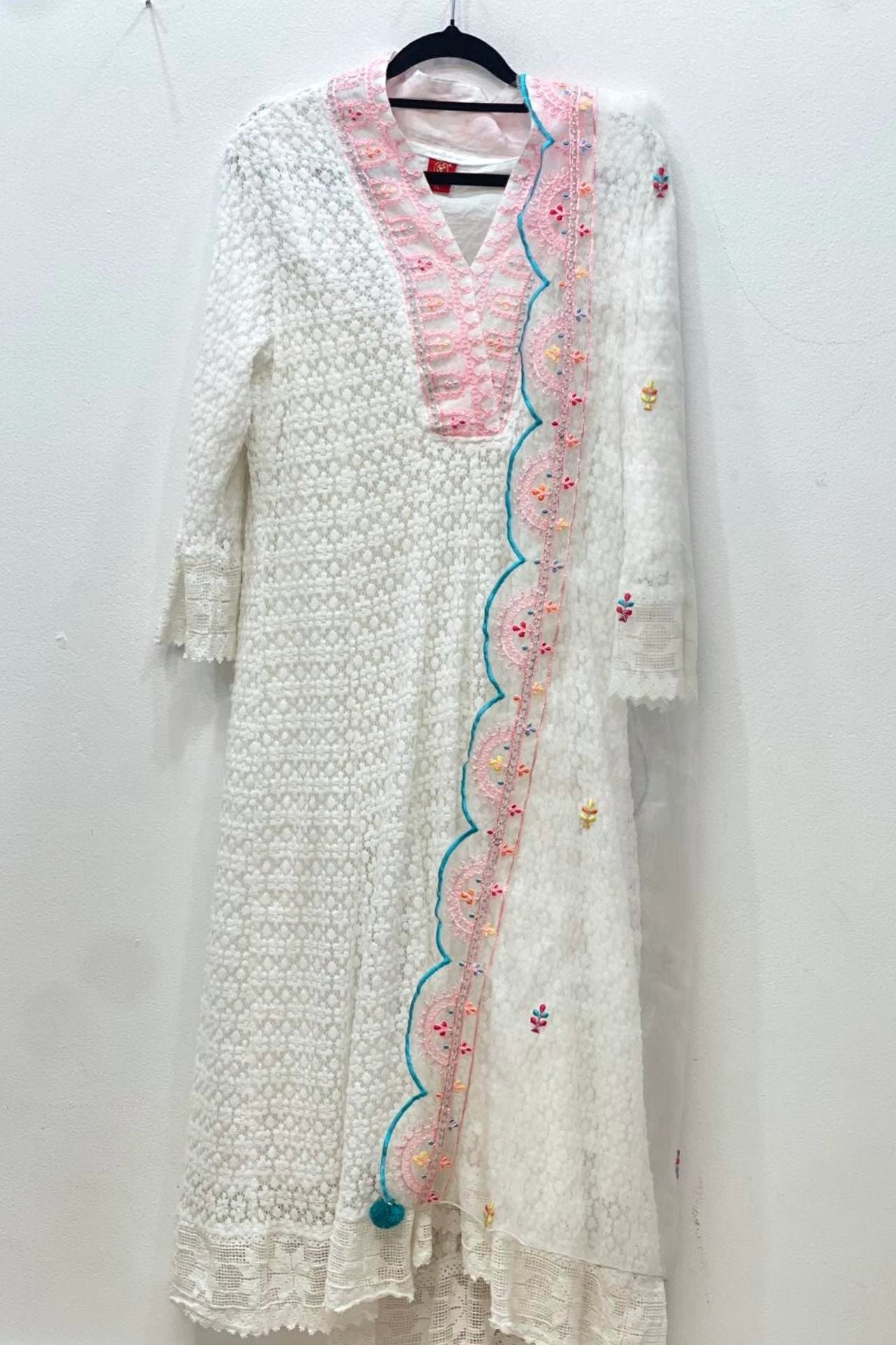 Design: Features a delicate floral lace-like texture throughout, a beautifully embroidered V-neckline, and a dupatta finished with a scalloped, colorful thread-work border.