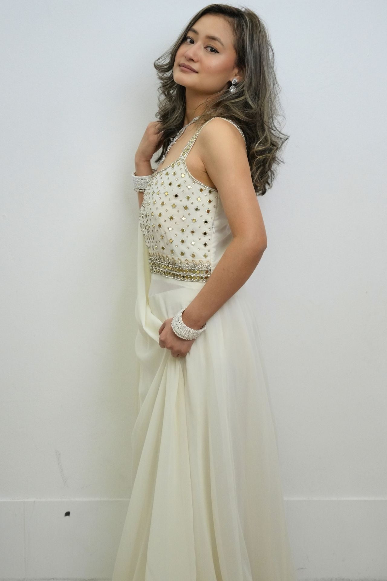 Design: Straight silhouette, heavily embellished sequin yoke, and a full-sleeved, flowy design.