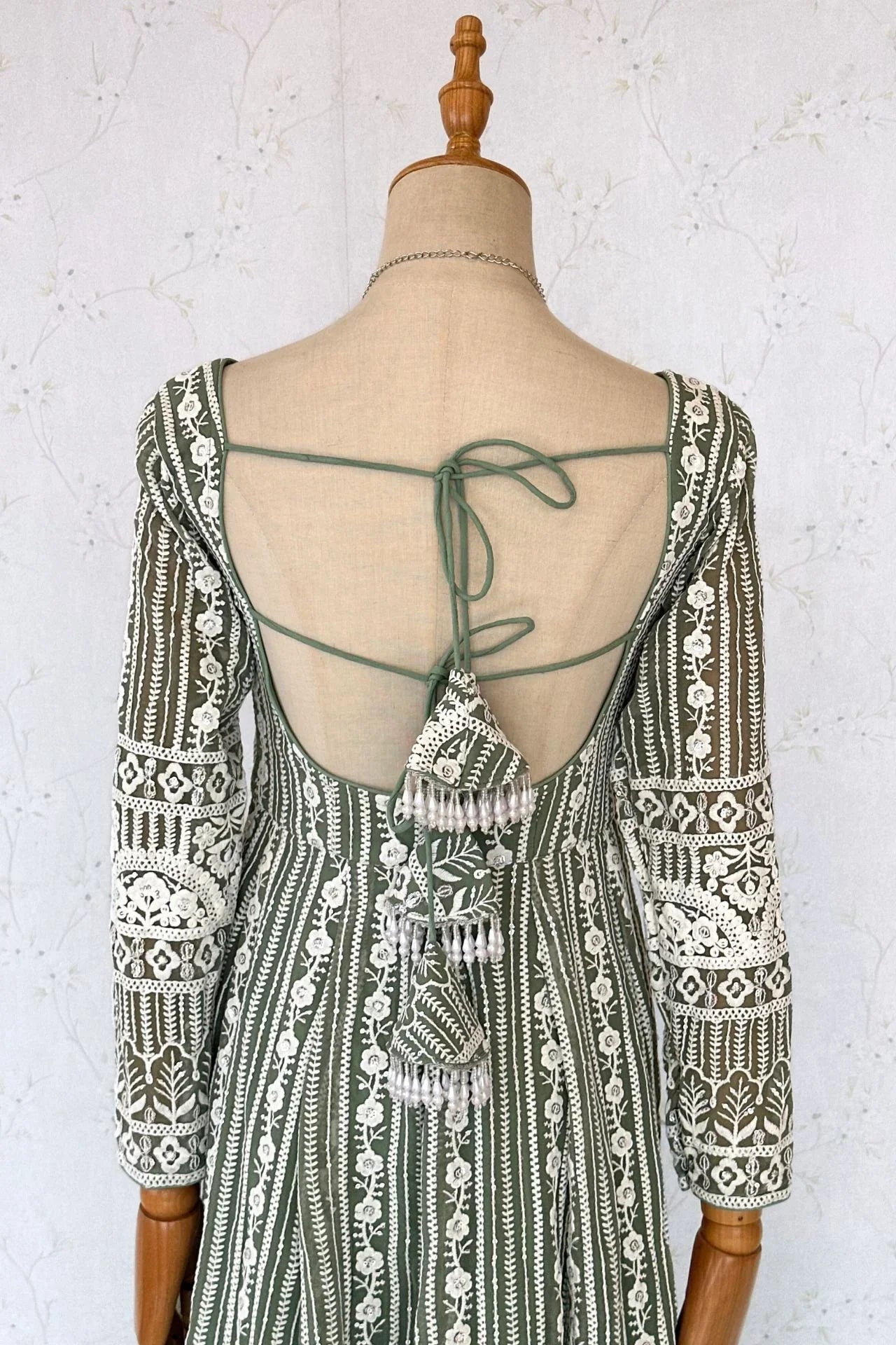 SageGreen Floral Threaded Anarkali Kurta Pant