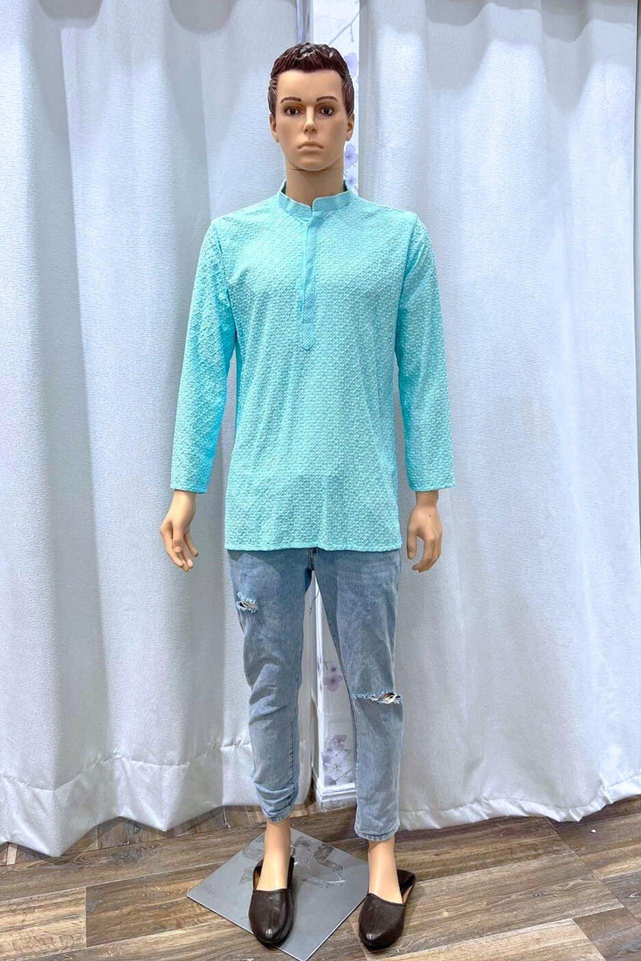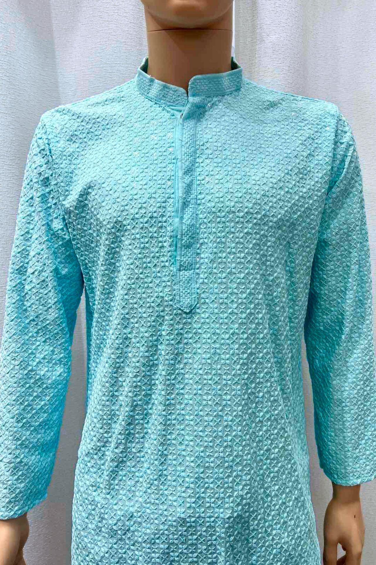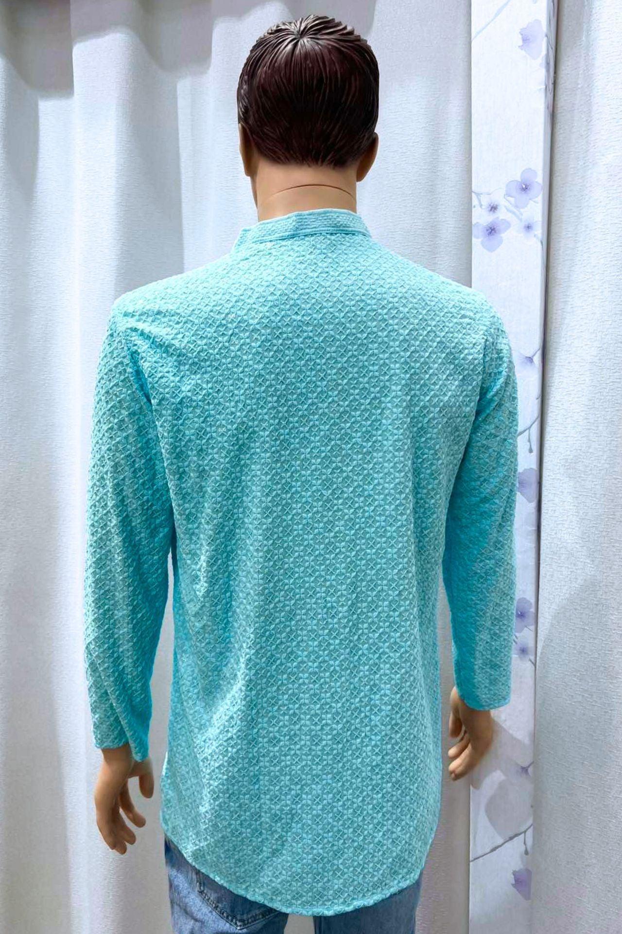 Skyblue Men's Kurta Top with Chickenkari Work