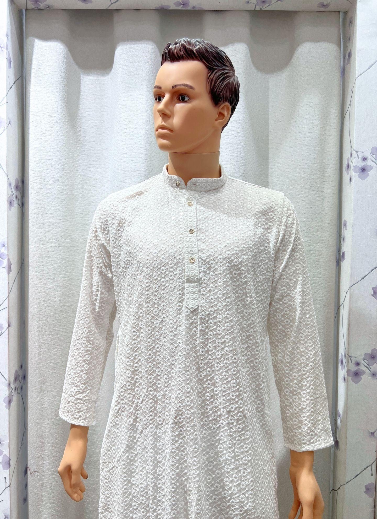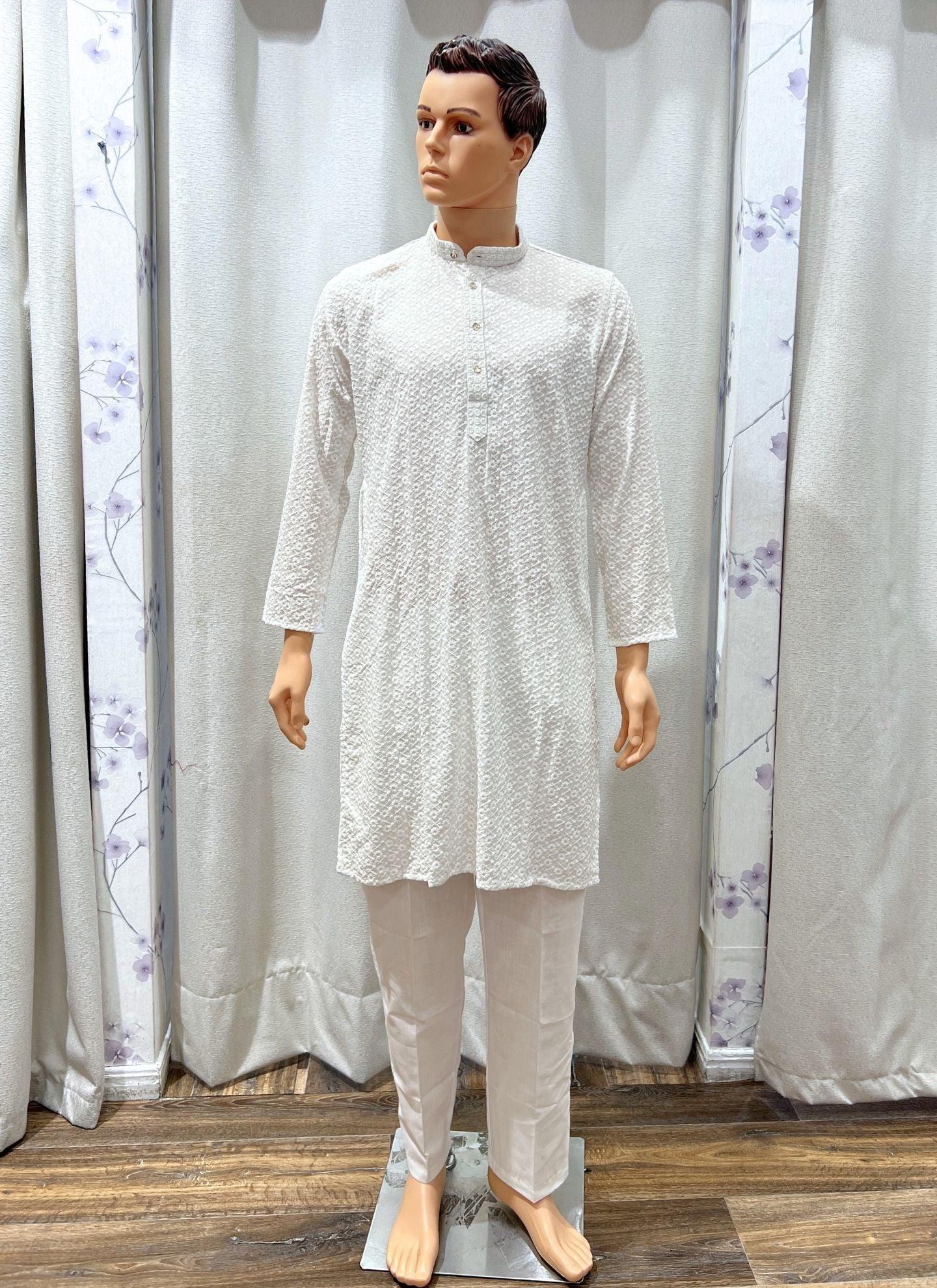 White Mens Chikankari Kurta Set