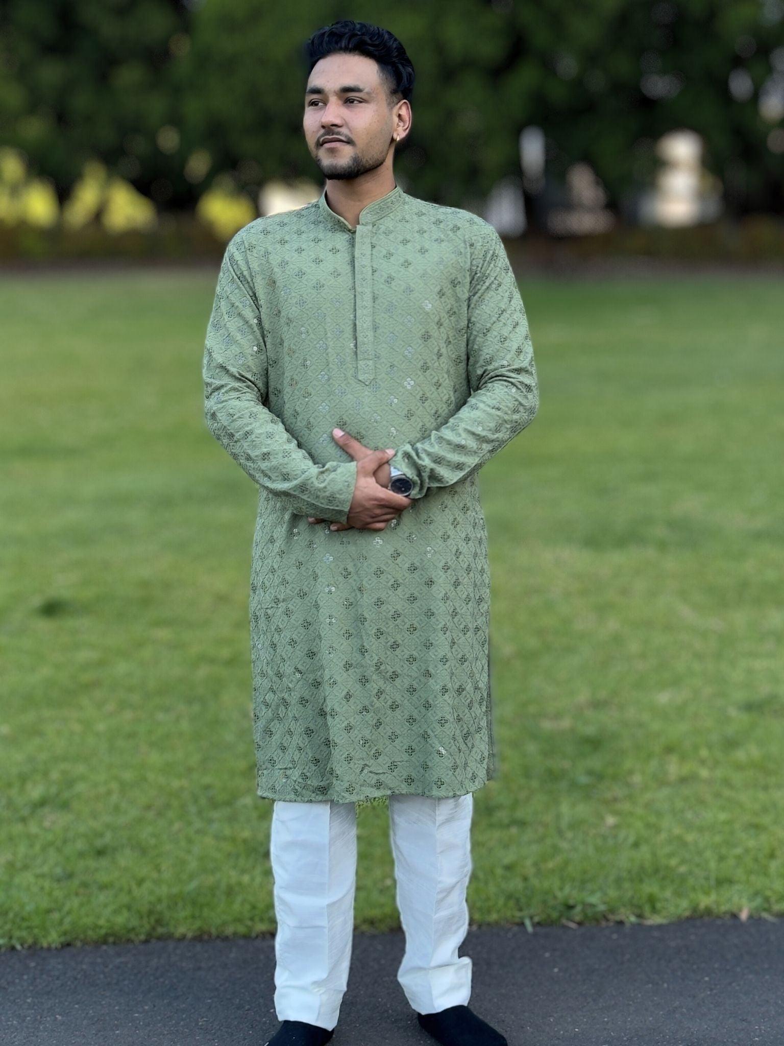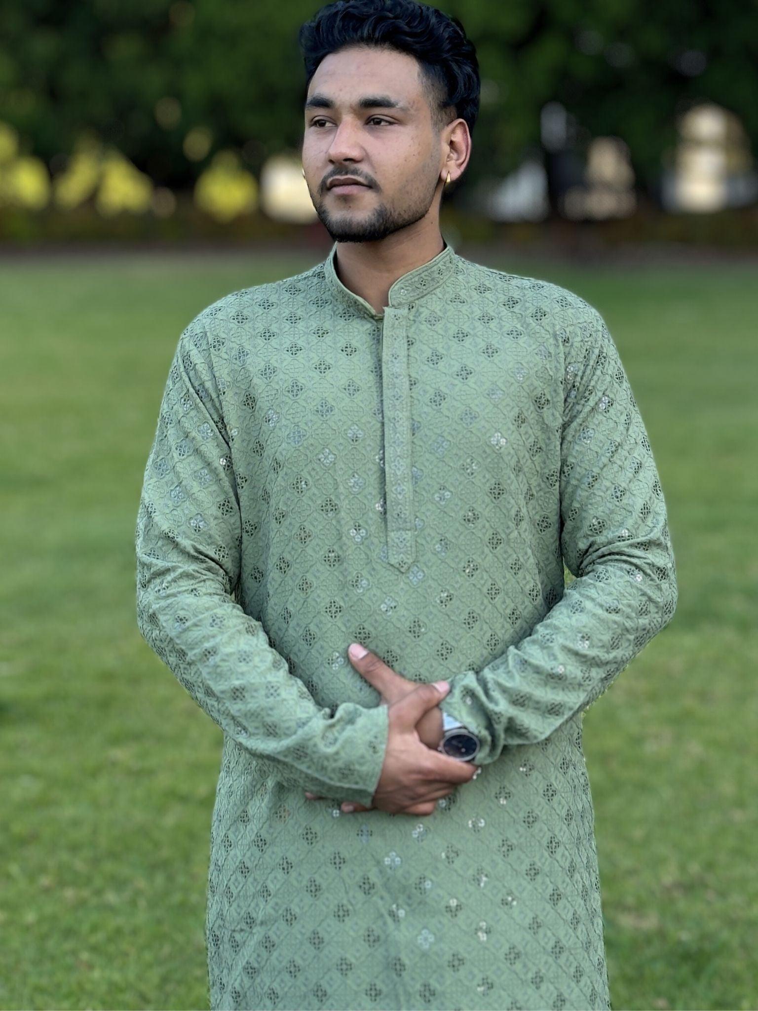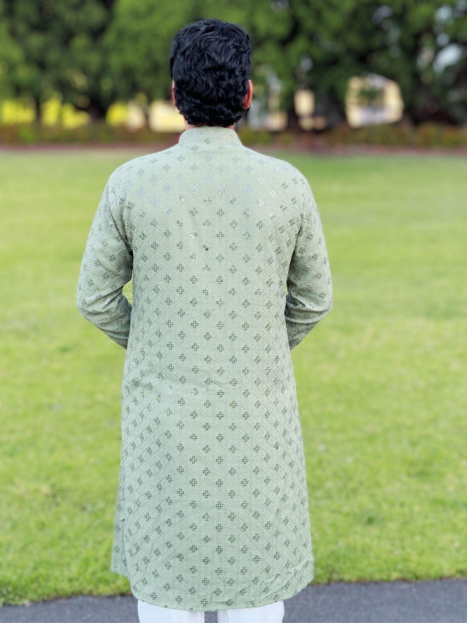 Olivegreen Mens Chikankari Kurta Set