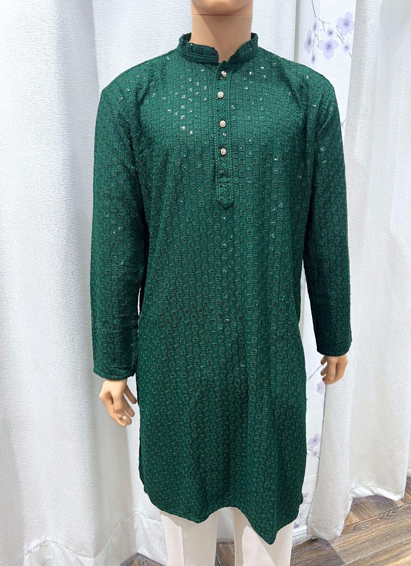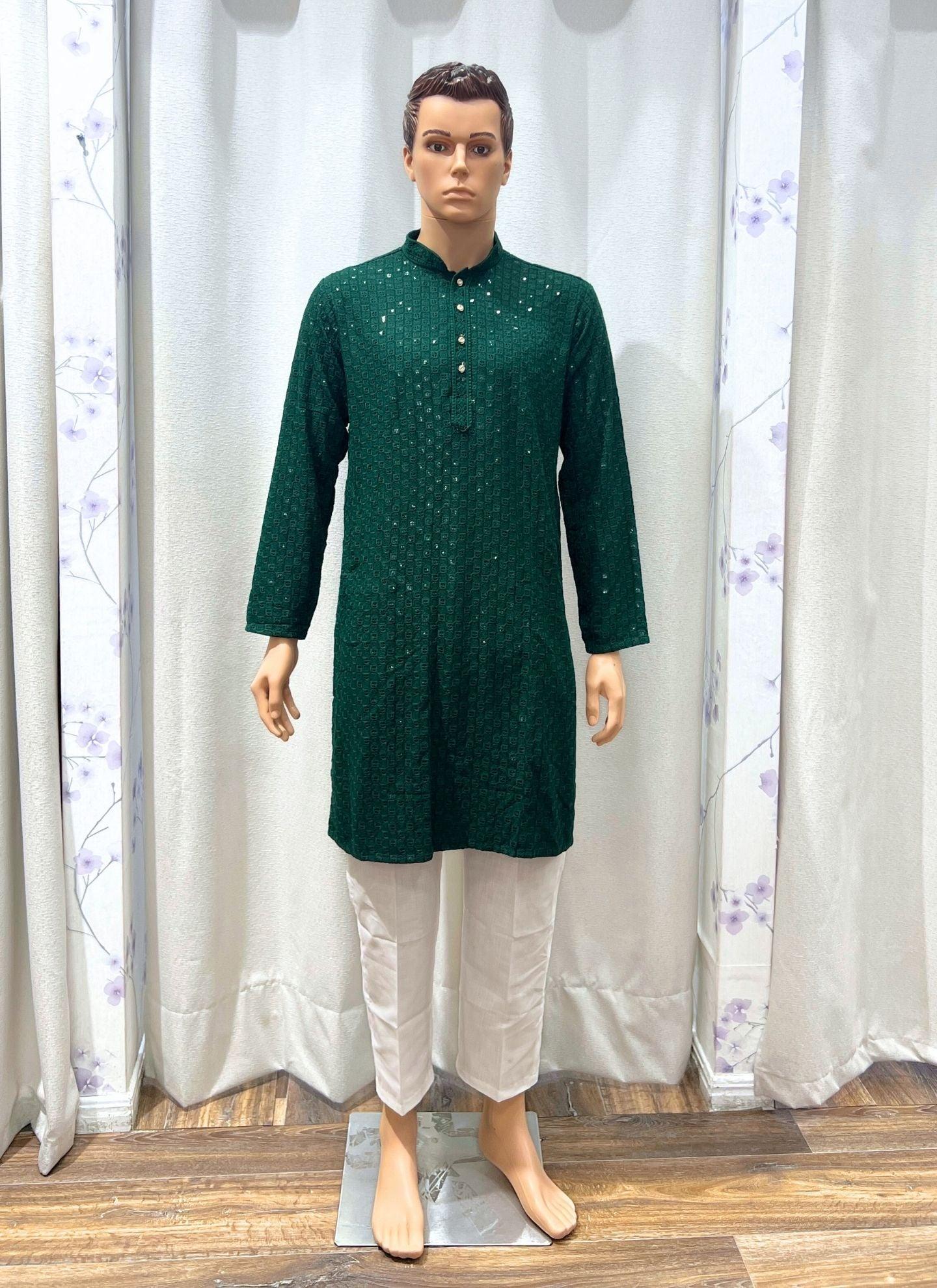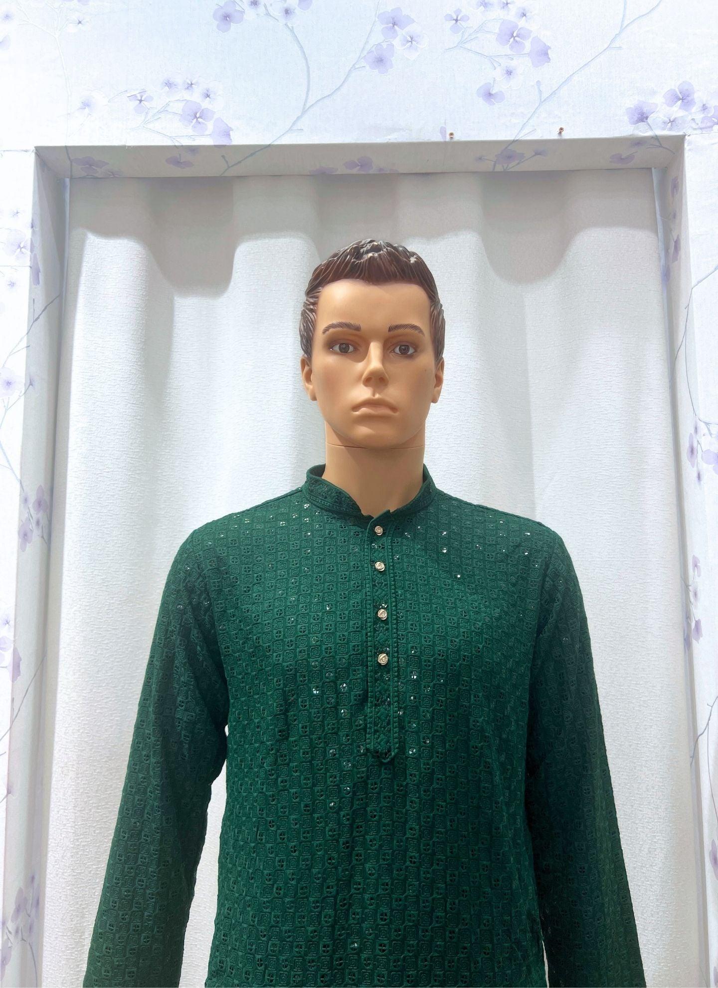 Chikankari Mens Kurta Set In Dark Green