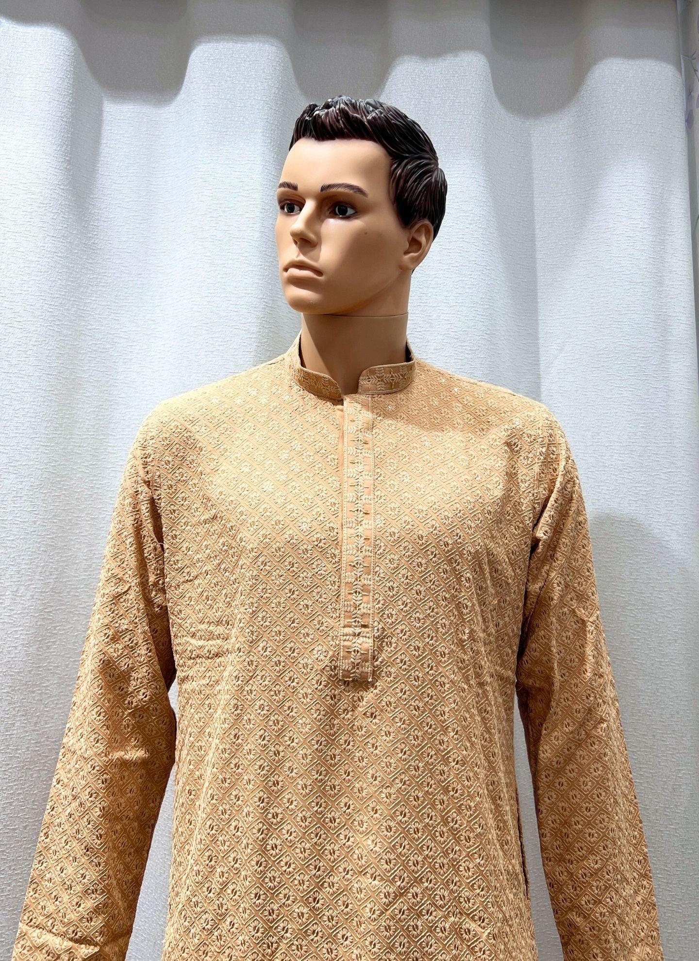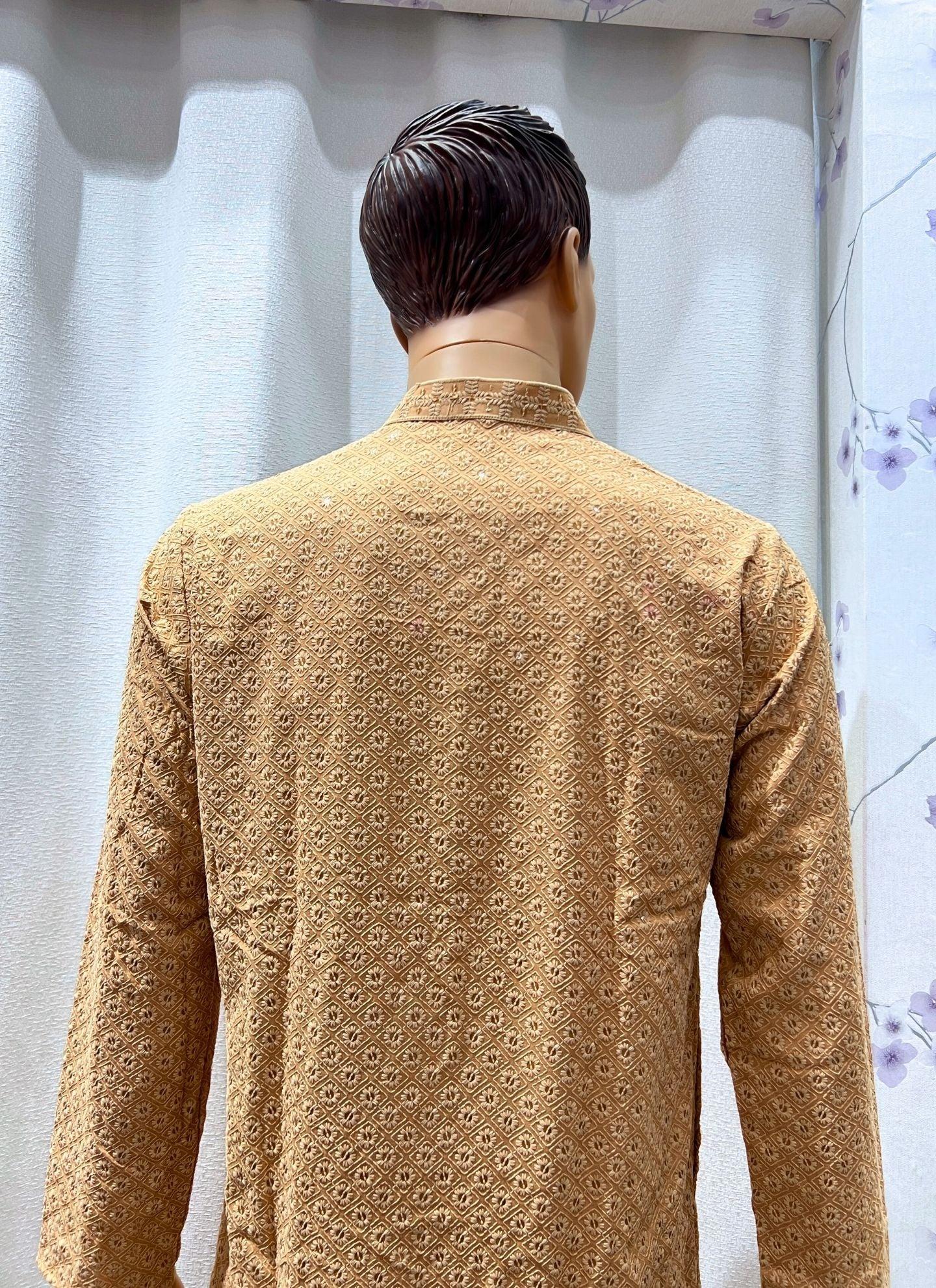 Chikankari Mens Kurta Set In Gold