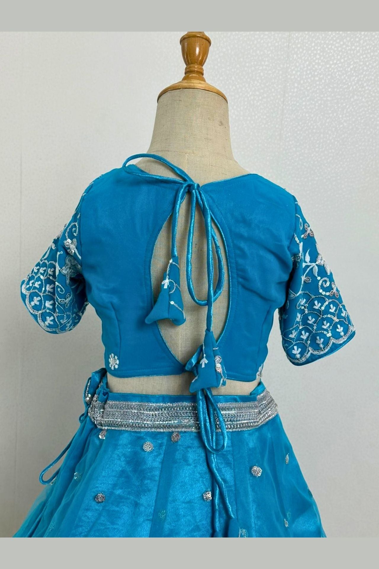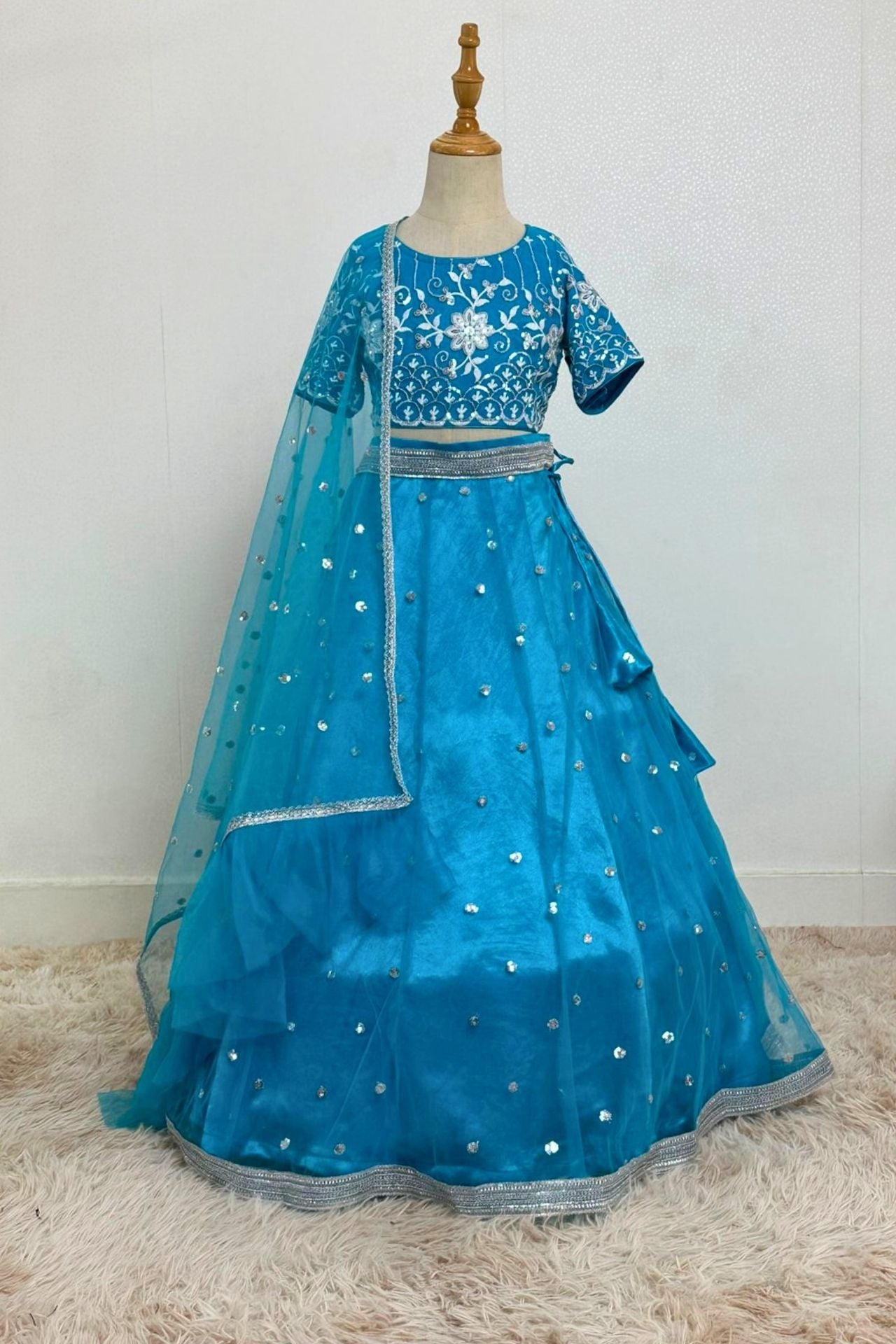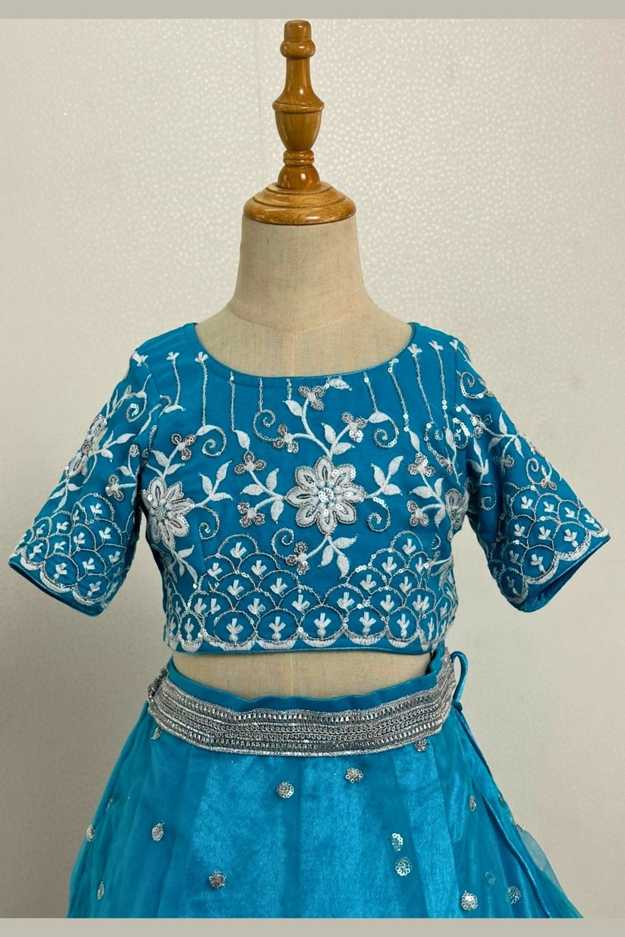 Vivid Turquoise Lehenga Set With White Thread Embroidery