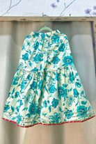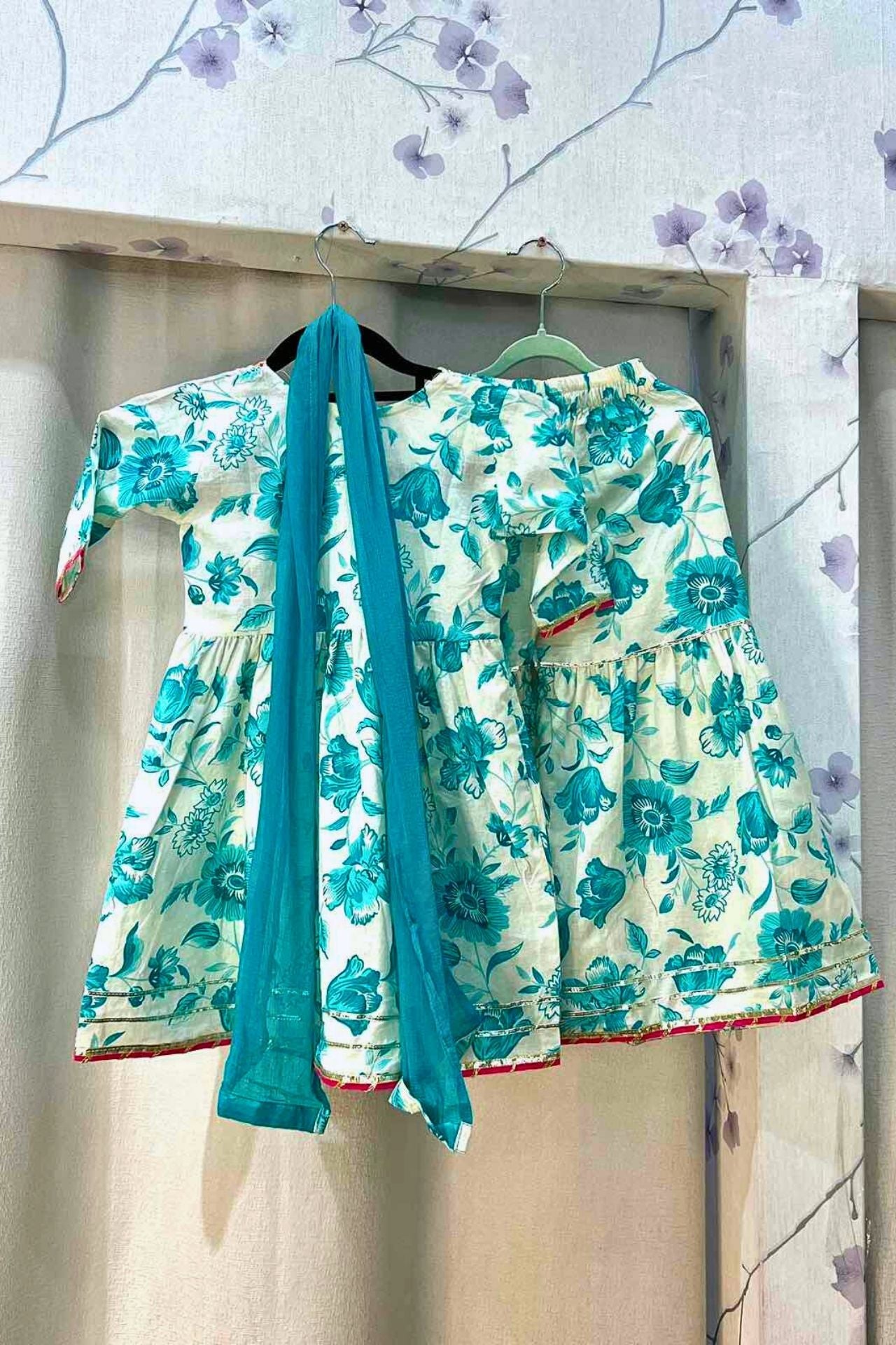 Features an elegant wrap-around Angrakha neckline and layered tiered bottoms, all accented with shimmering gold gota patti lace.