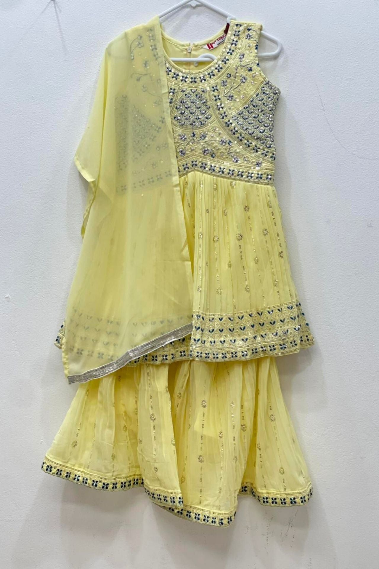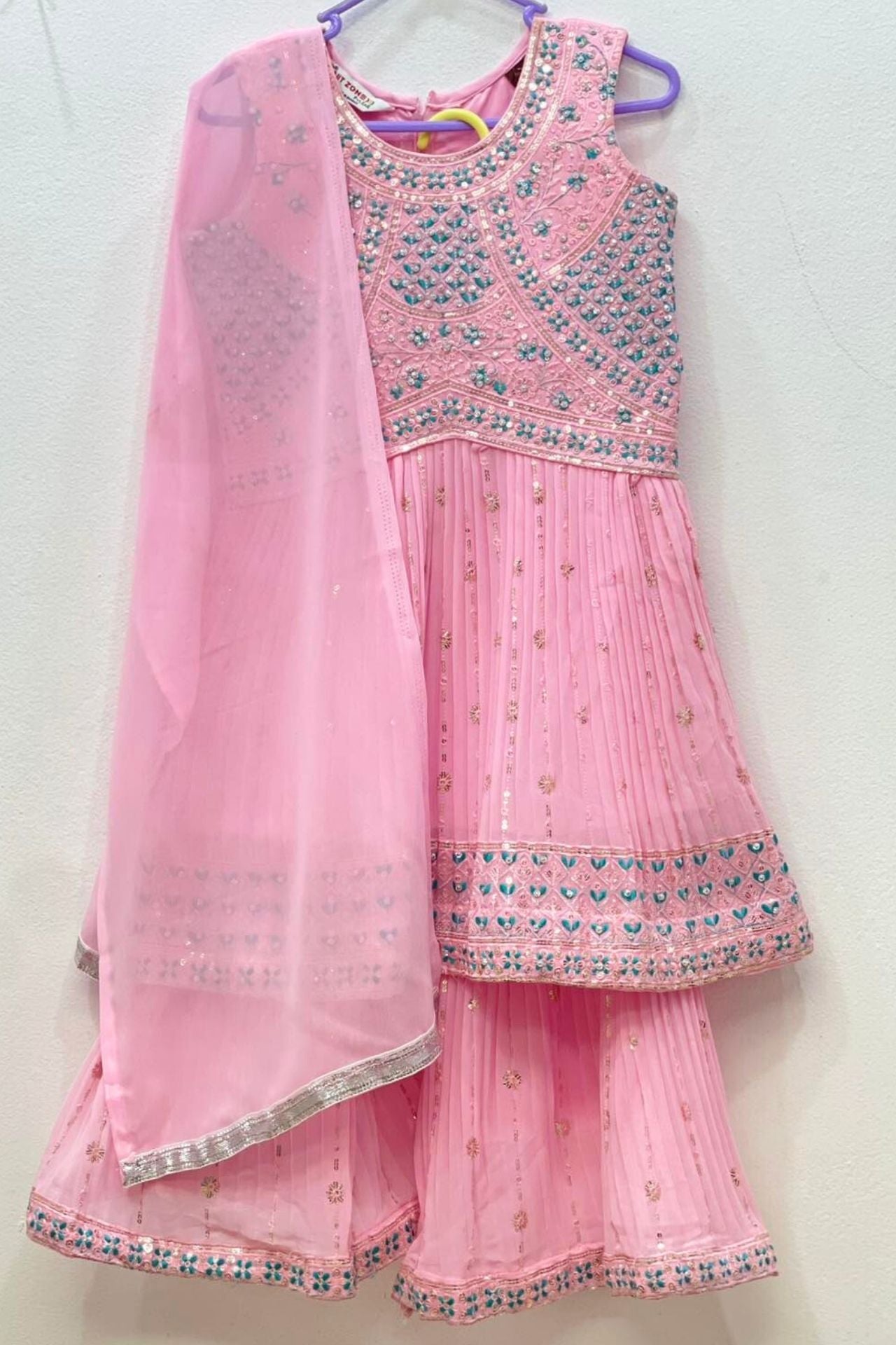 The top features a heavily embellished bodice with mirror-work style sequins and floral thread embroidery, leading into a micro-pleated peplum hem. The matching sharara pants mirror this detail with intricate borders.