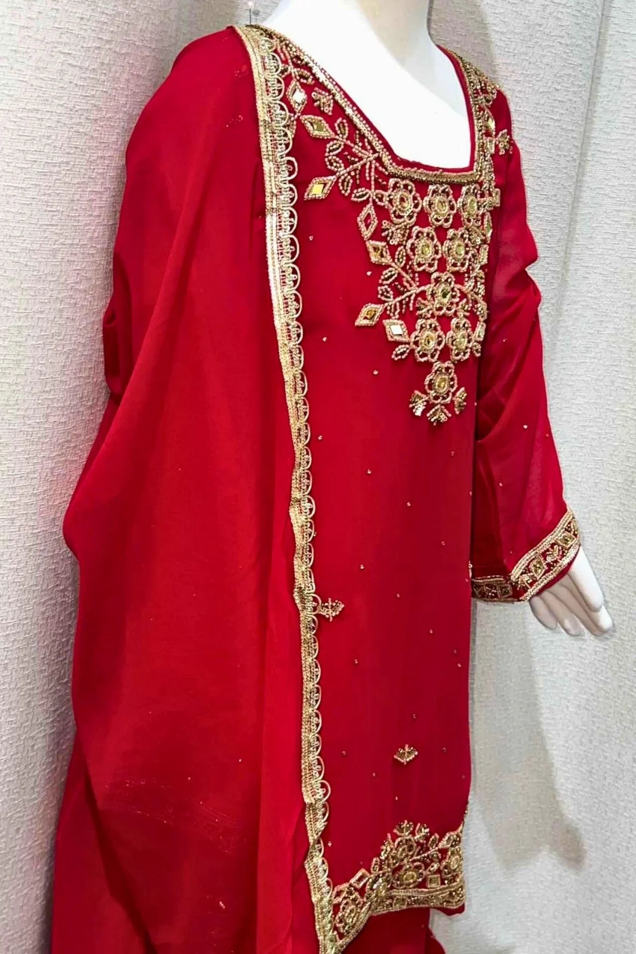 Delight your little one with this charming 3-piece Sharara set, beautifully adorned with intricate handwork.