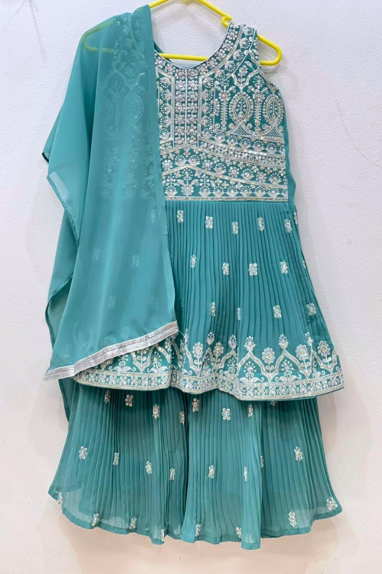 Features a heavily embroidered bodice with traditional motifs, paired with a stylish pleated peplum top and voluminous tiered sharara pants.