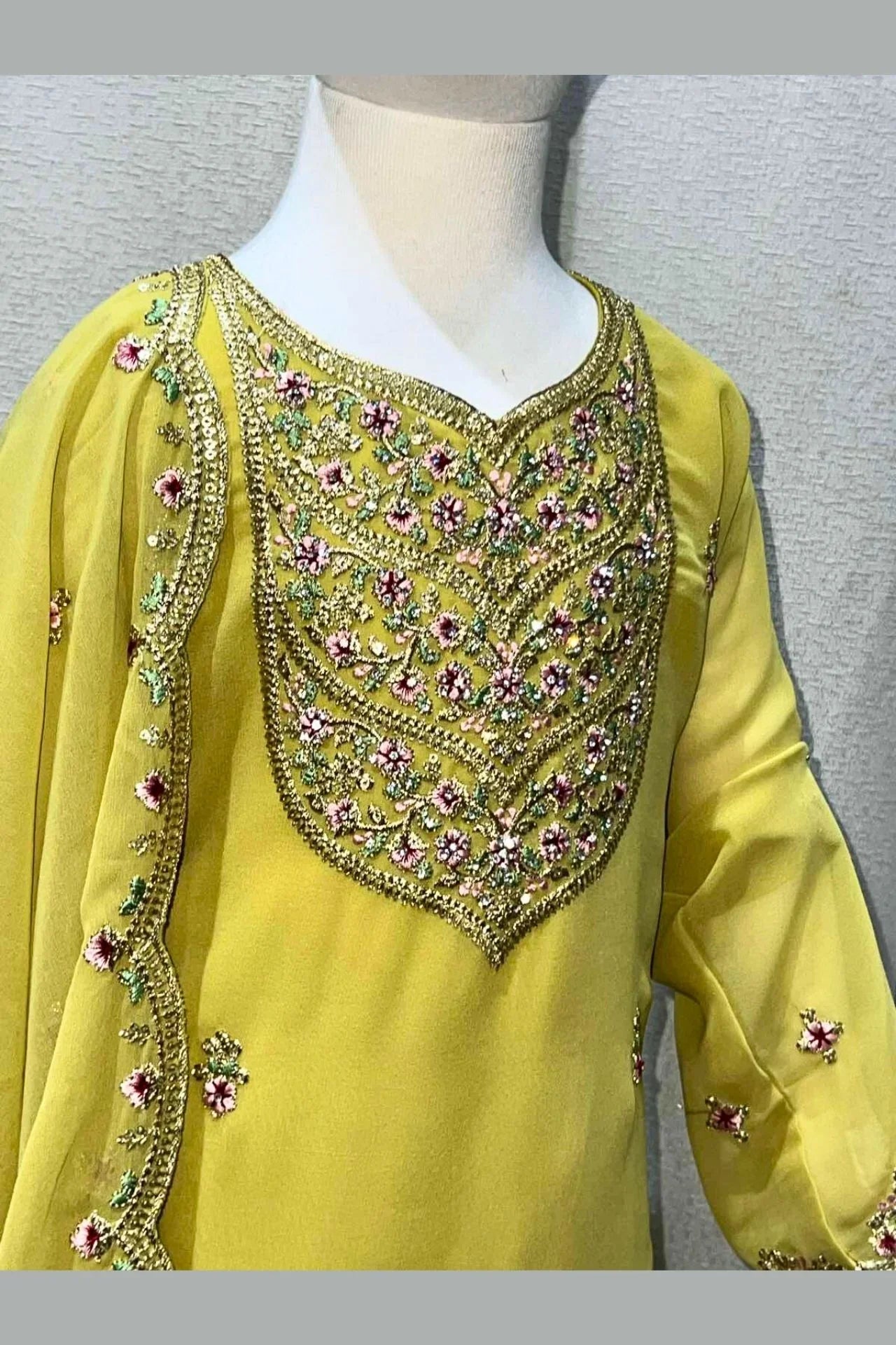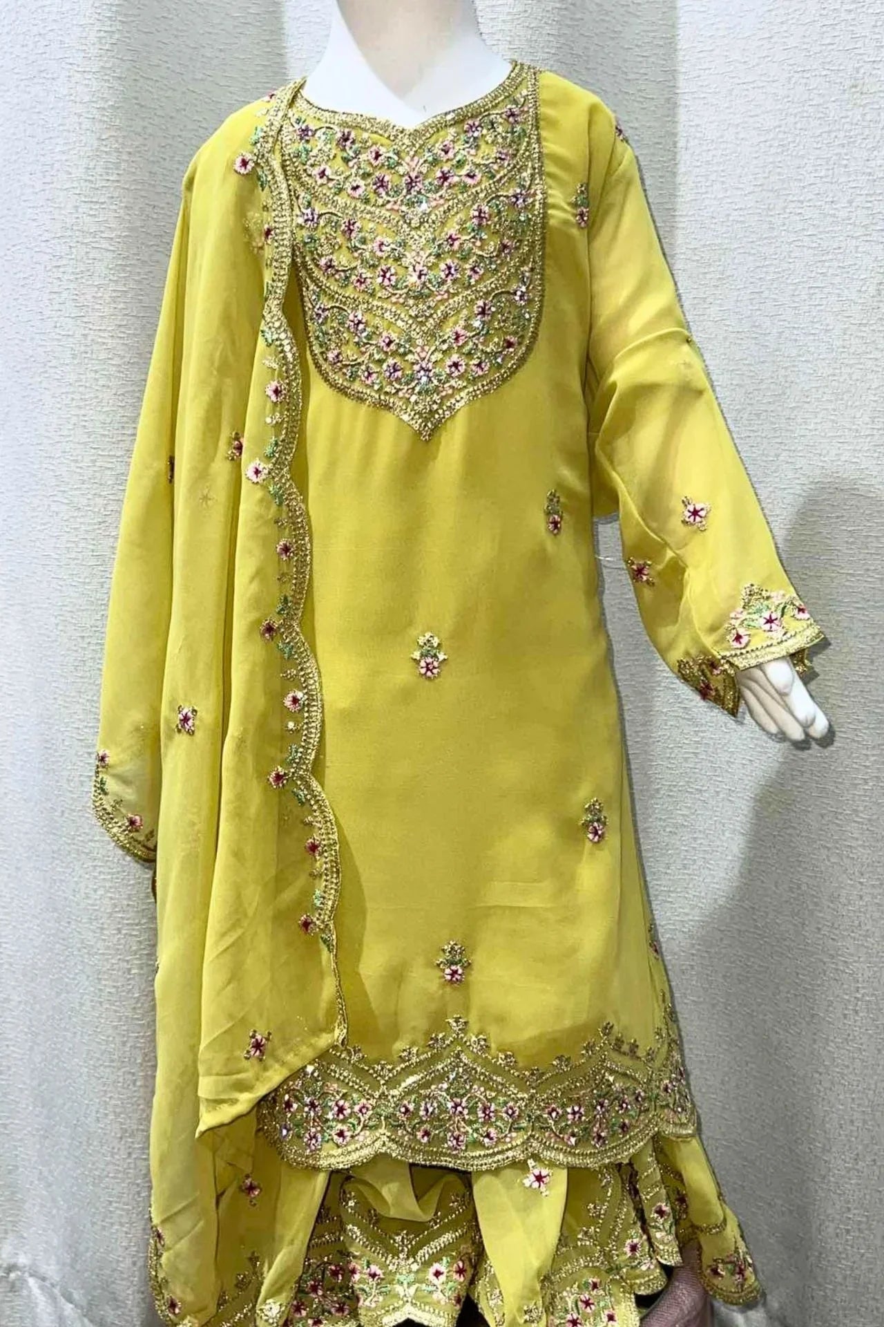 Delight your little one with this charming 3-piece Sharara set, beautifully adorned with intricate Embroidery work.