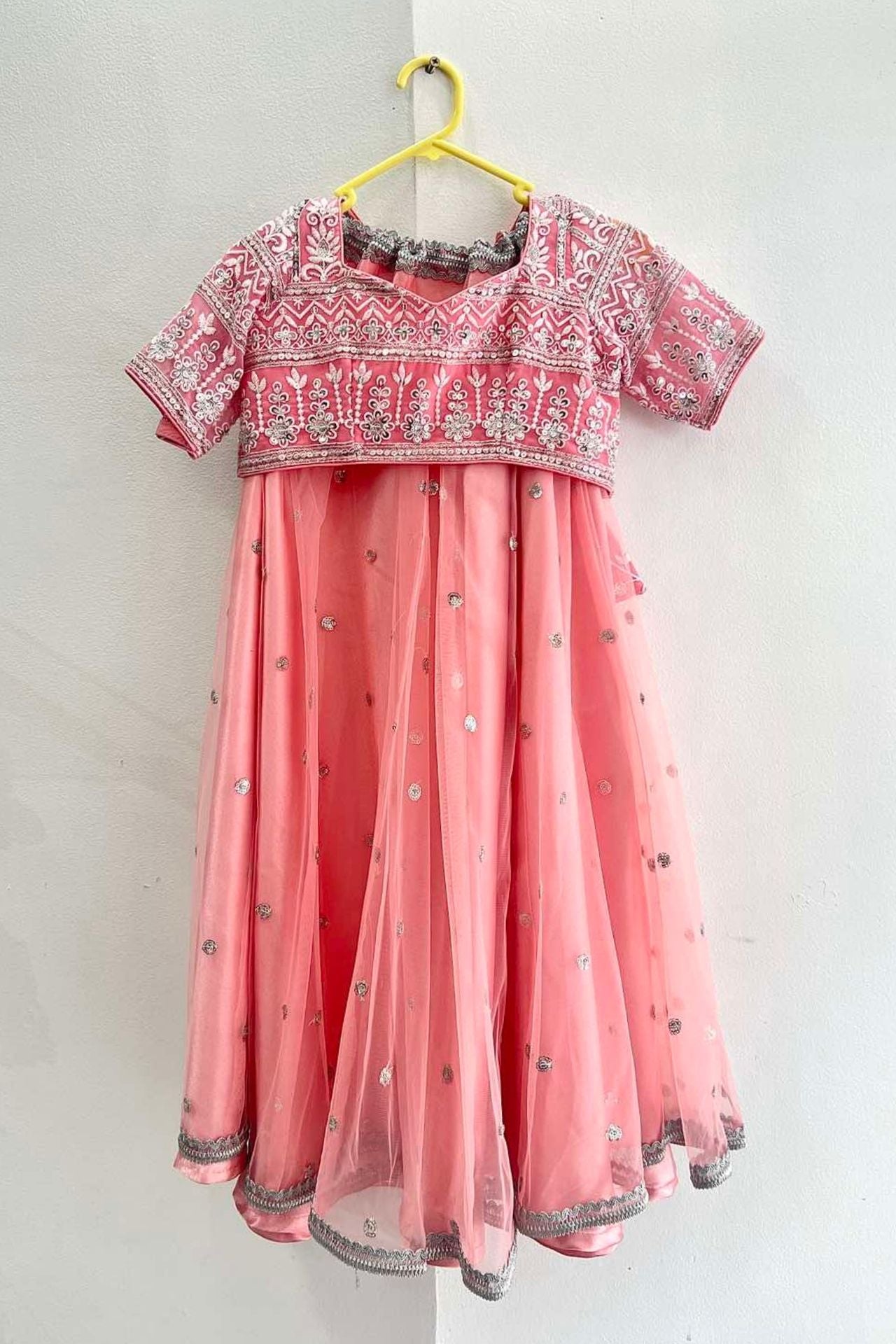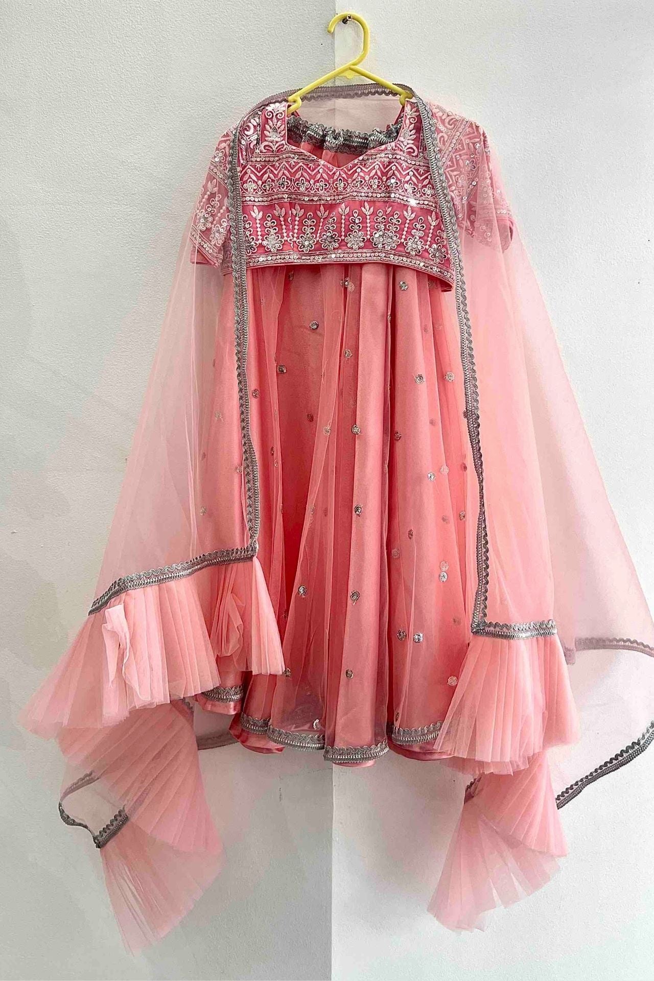 Design: Features a heavy intricate floral embroidery on the choli, silver sequin "butti" work across the lehenga, and a unique pleated ruffle border on the dupatta.