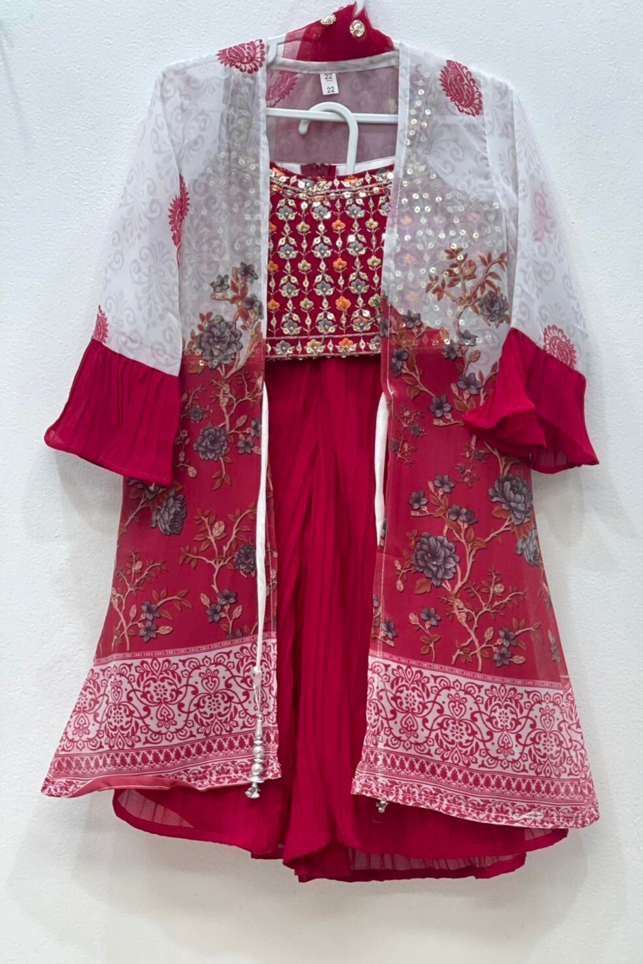 Set includes: 1 Embroidered Choli, 1 Pleated Lehenga, and 1 Floral Long Jacket.