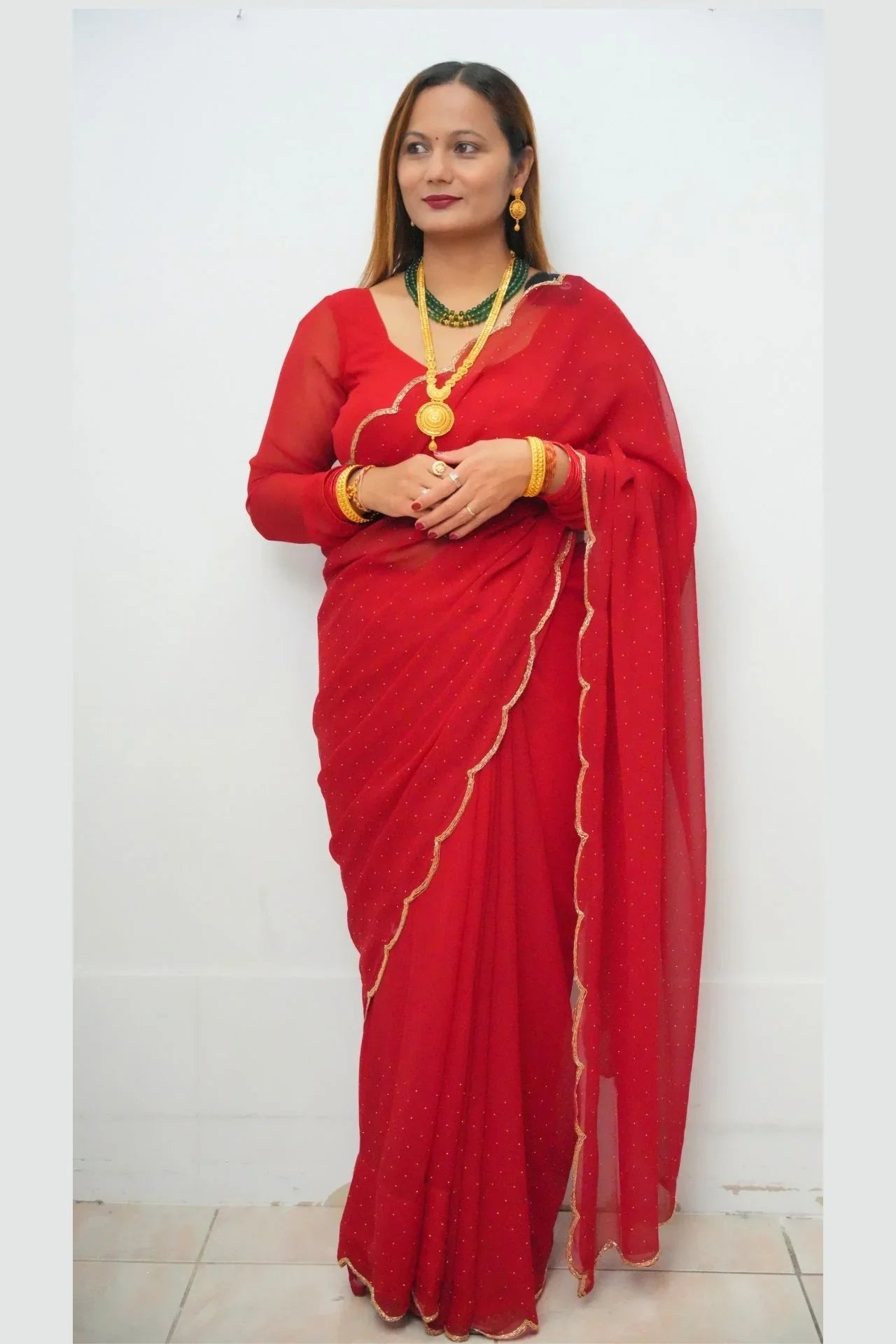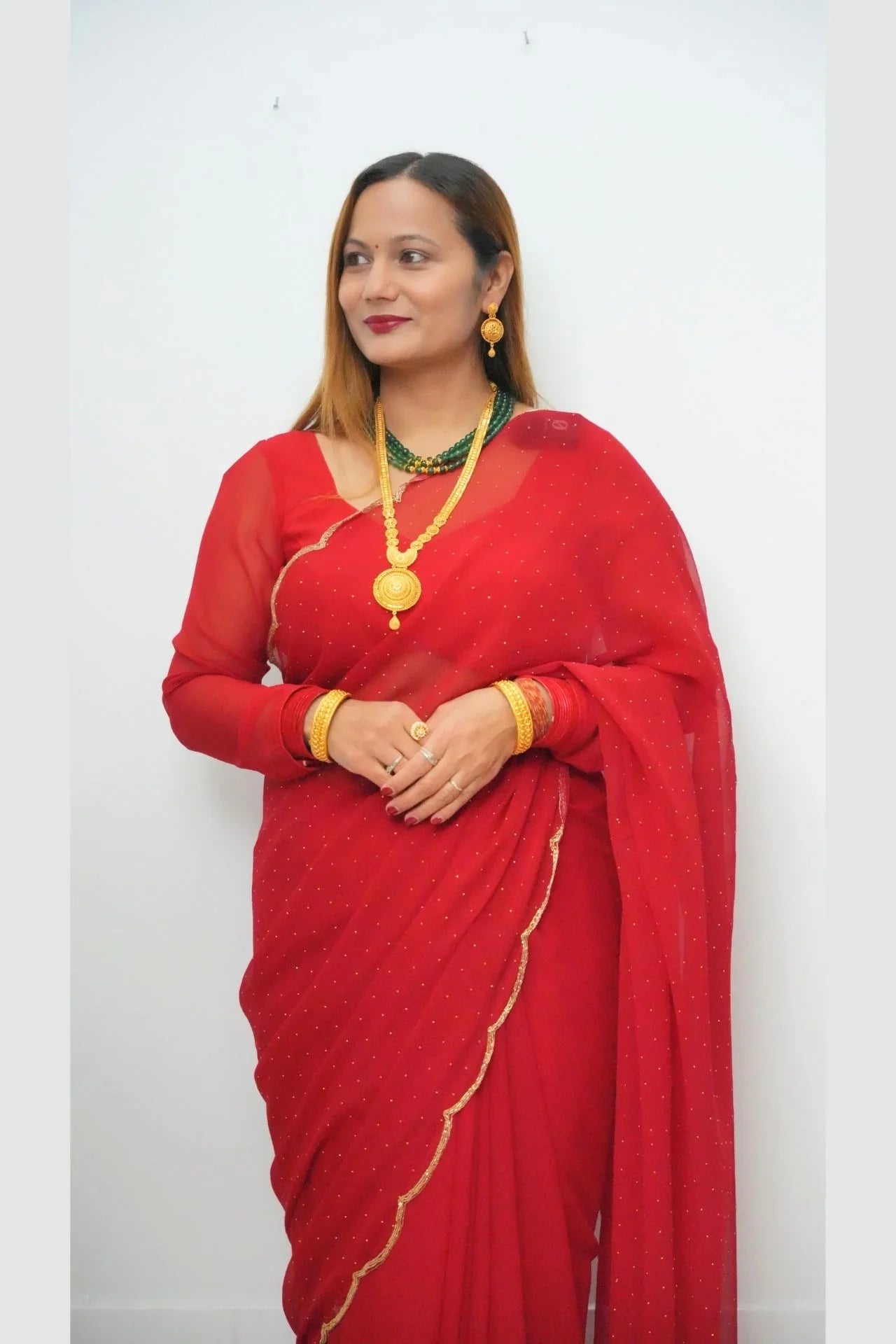 - ✦ Blouse: Matching Red Georgette blouse piece.