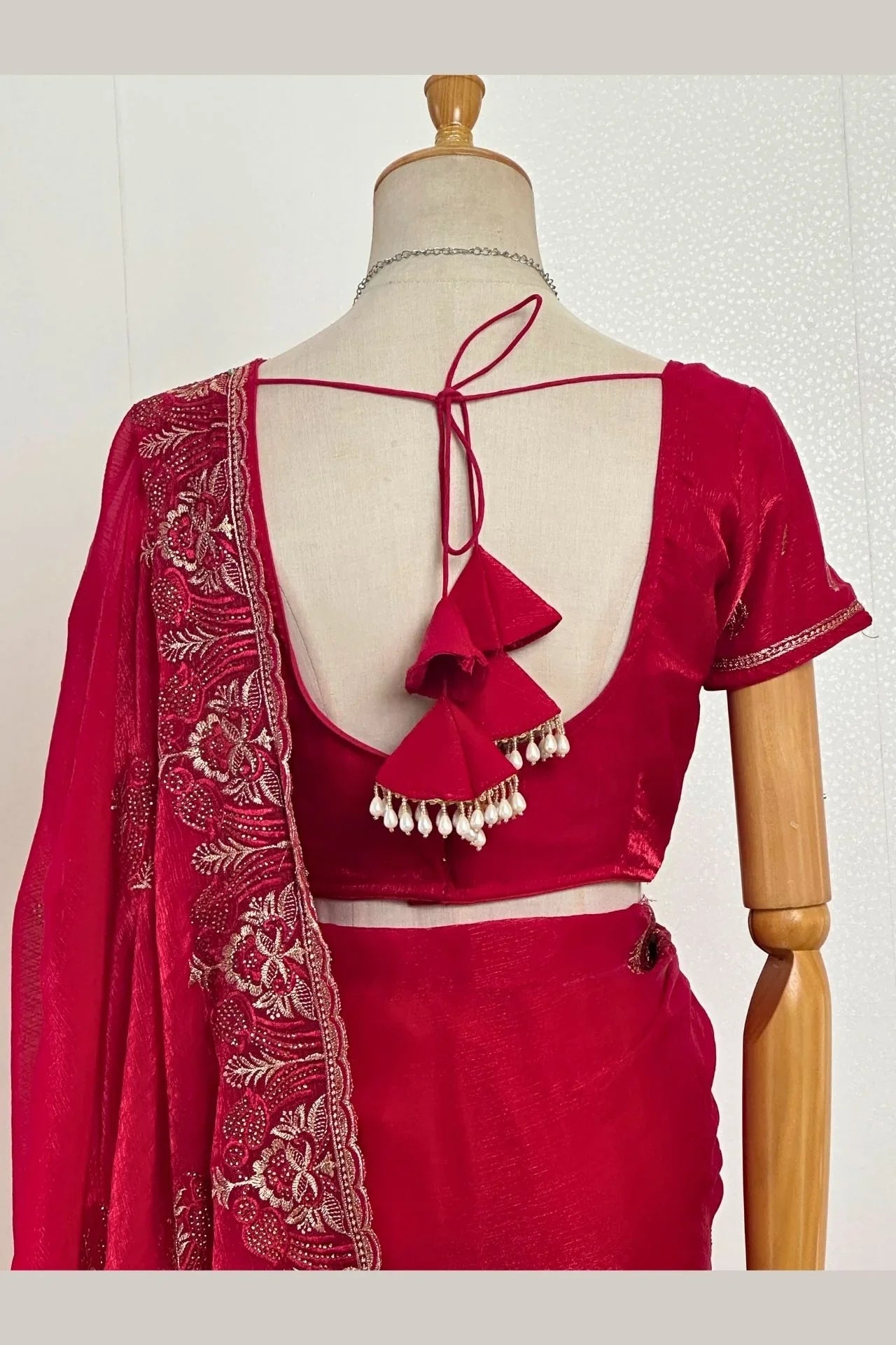 - ✦ Blouse: Matching Maroon blouse piece with coordinated embroidery at the neckline and sleeves (Styled as a short-sleeve design).