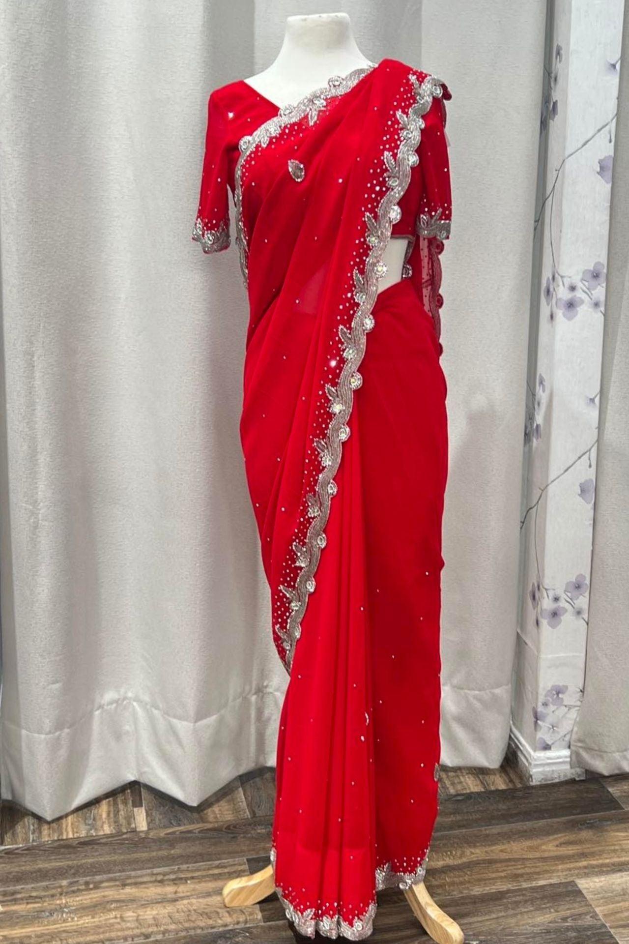 Georgette Saree Set In Red with Sworoski Crystal