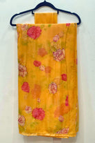 Features a delicate floral digital print enhanced with subtle hand-worked highlights and a shimmering gold-beaded border.