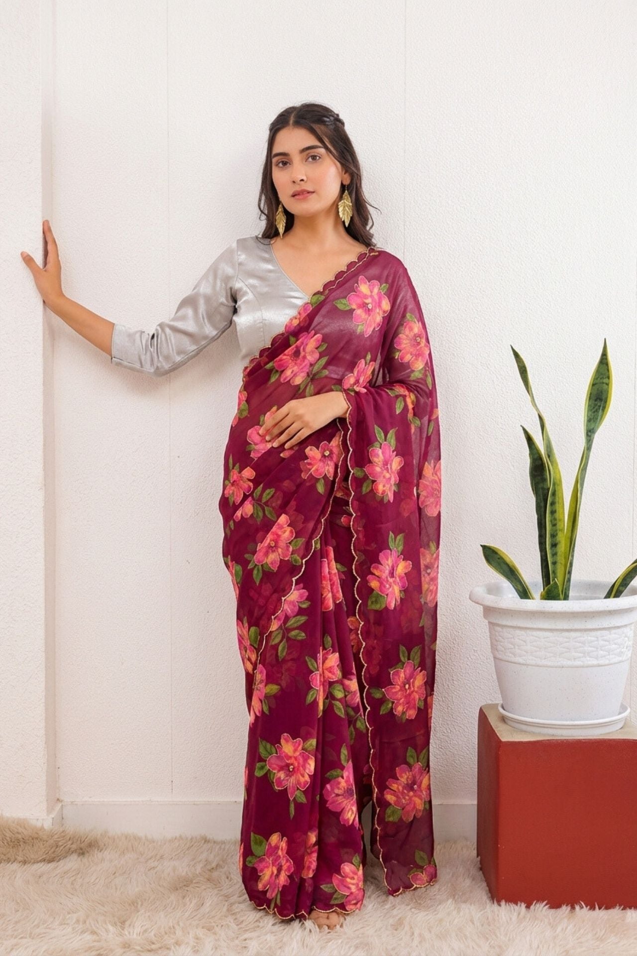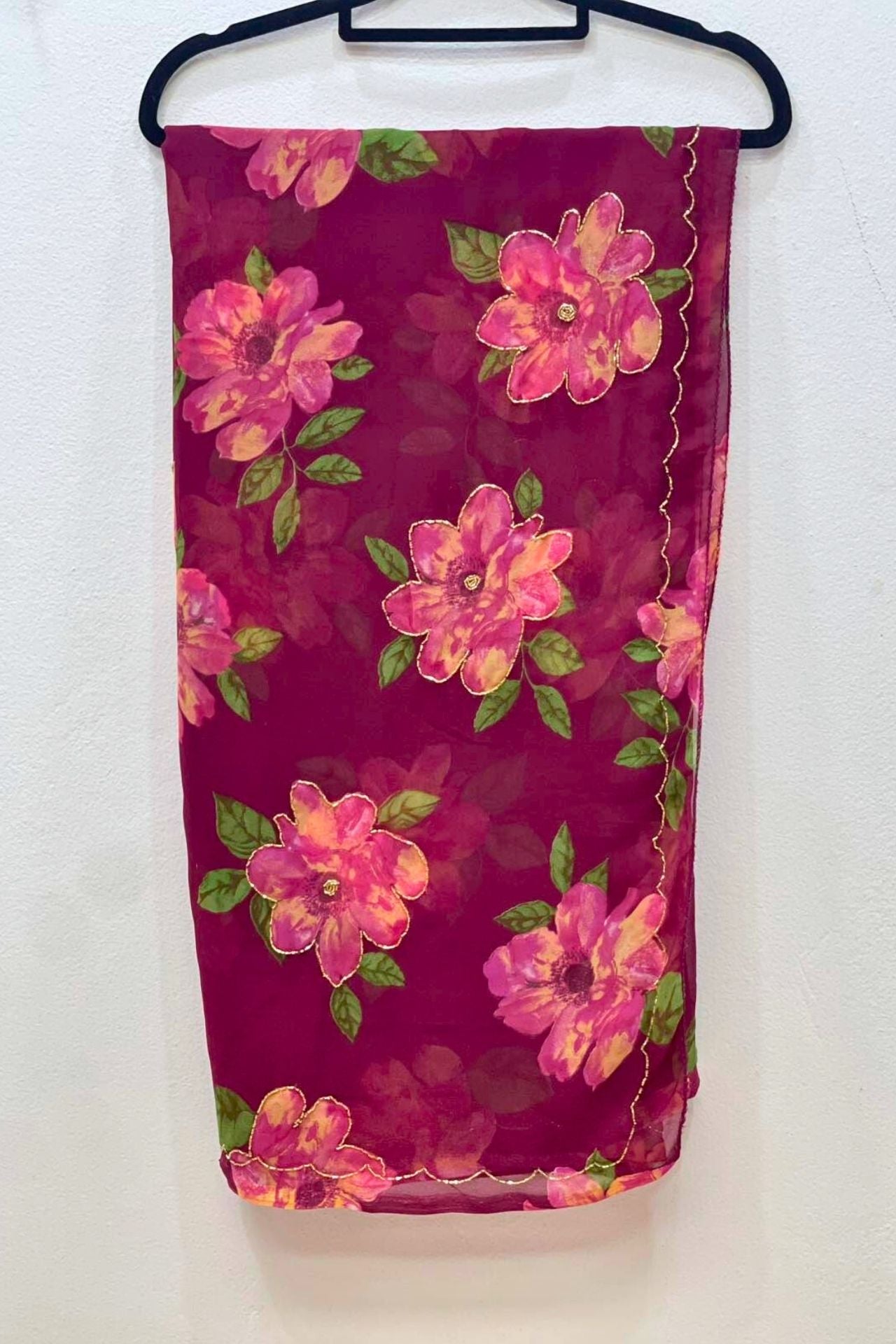 Magenta Chiffon Saree With Pink Floral Print