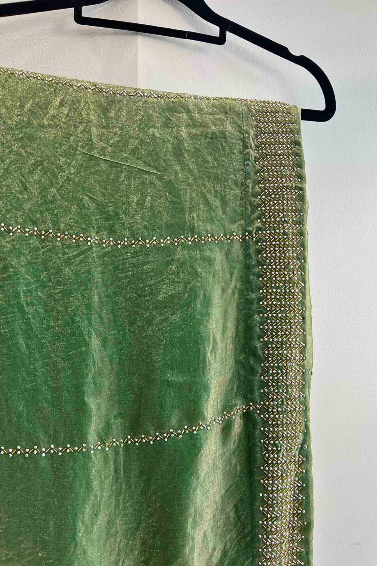 Olive Green Crushed Chiffon Saree with Gold Bead Border