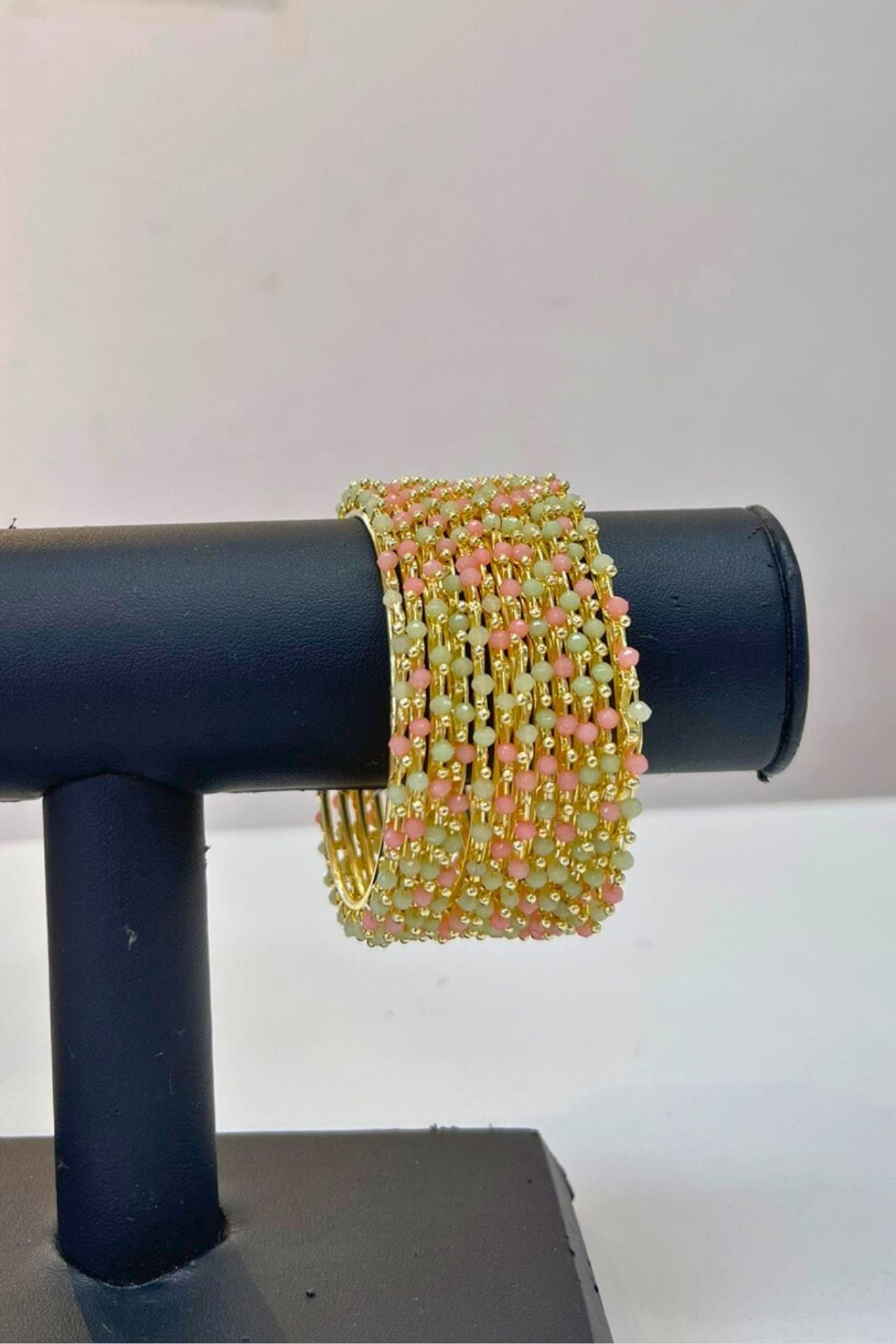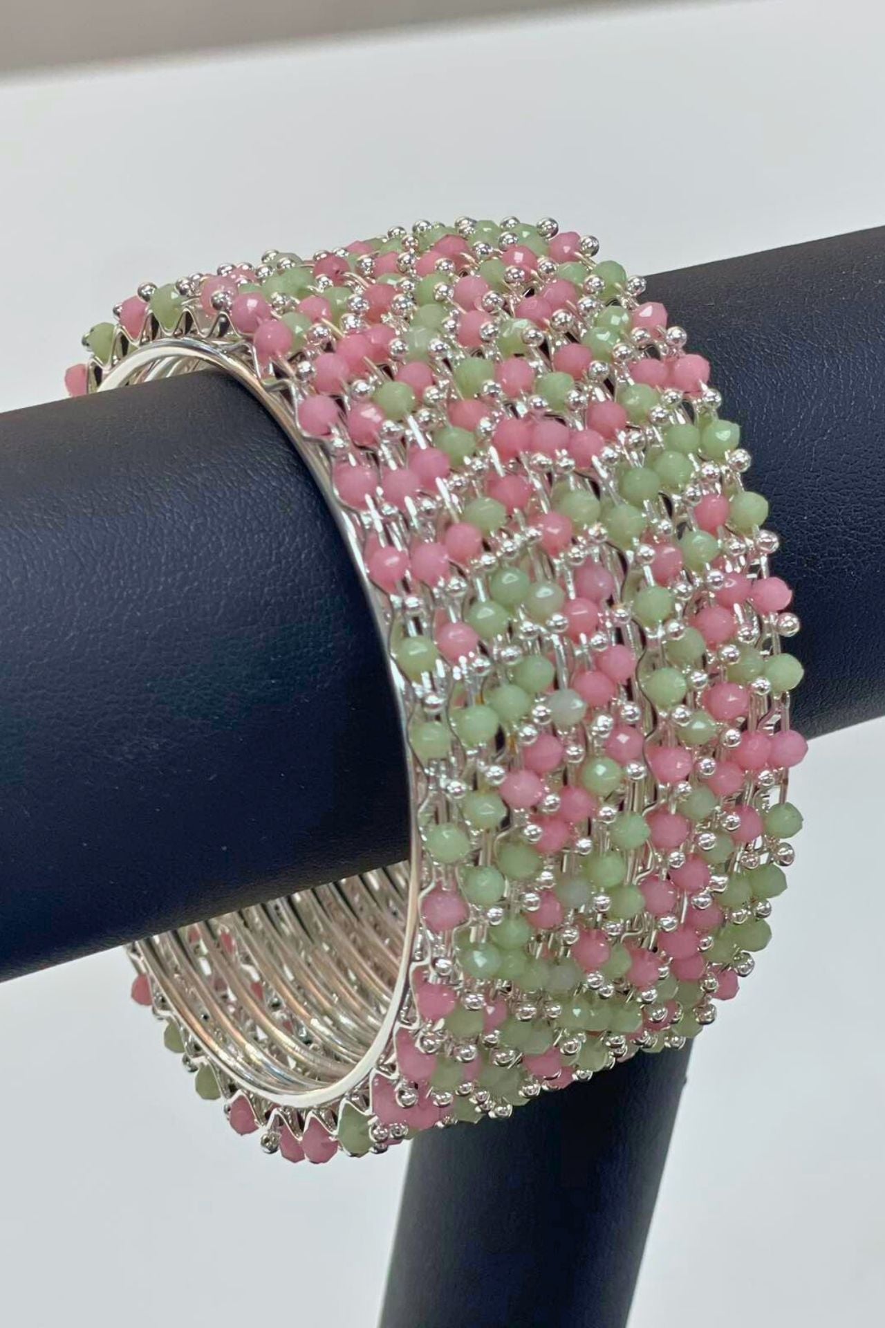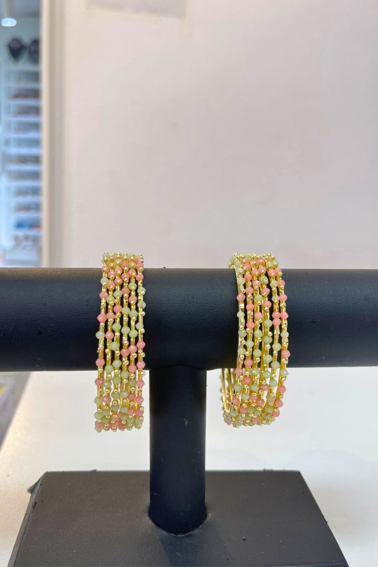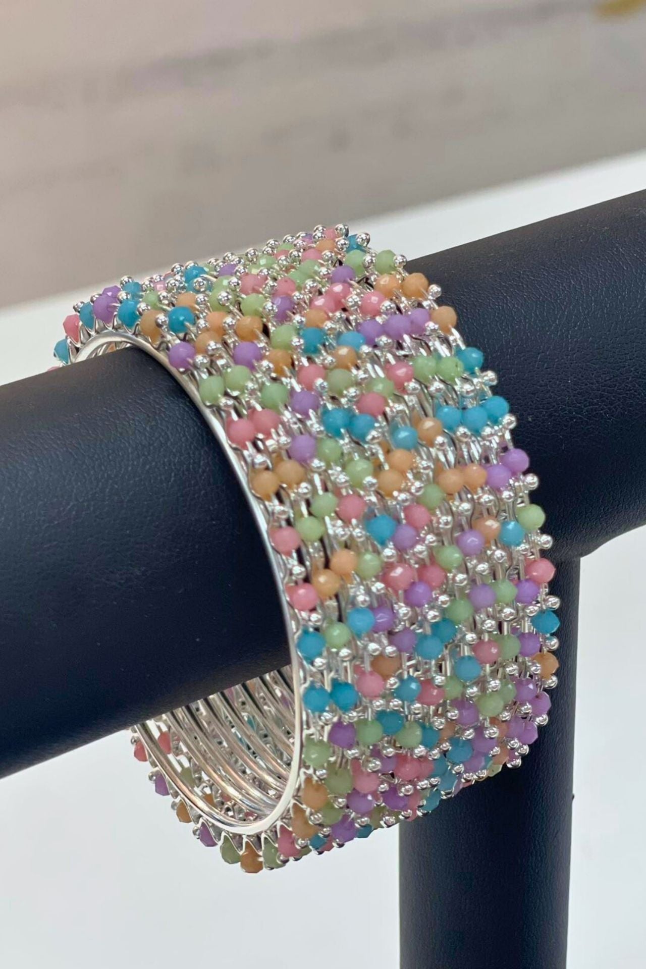 Design: Each thin bangle is fully lined with alternating rows of tiny, colorful beads, giving a light, bubbly texture and a spring-like color palette.