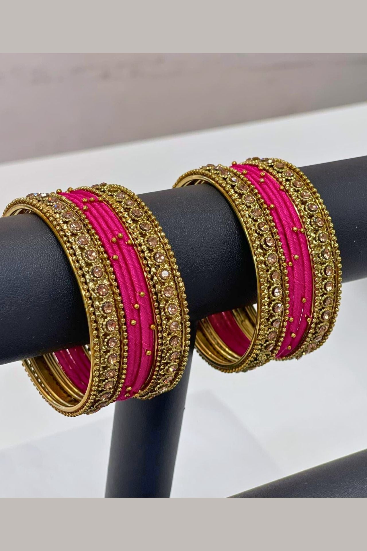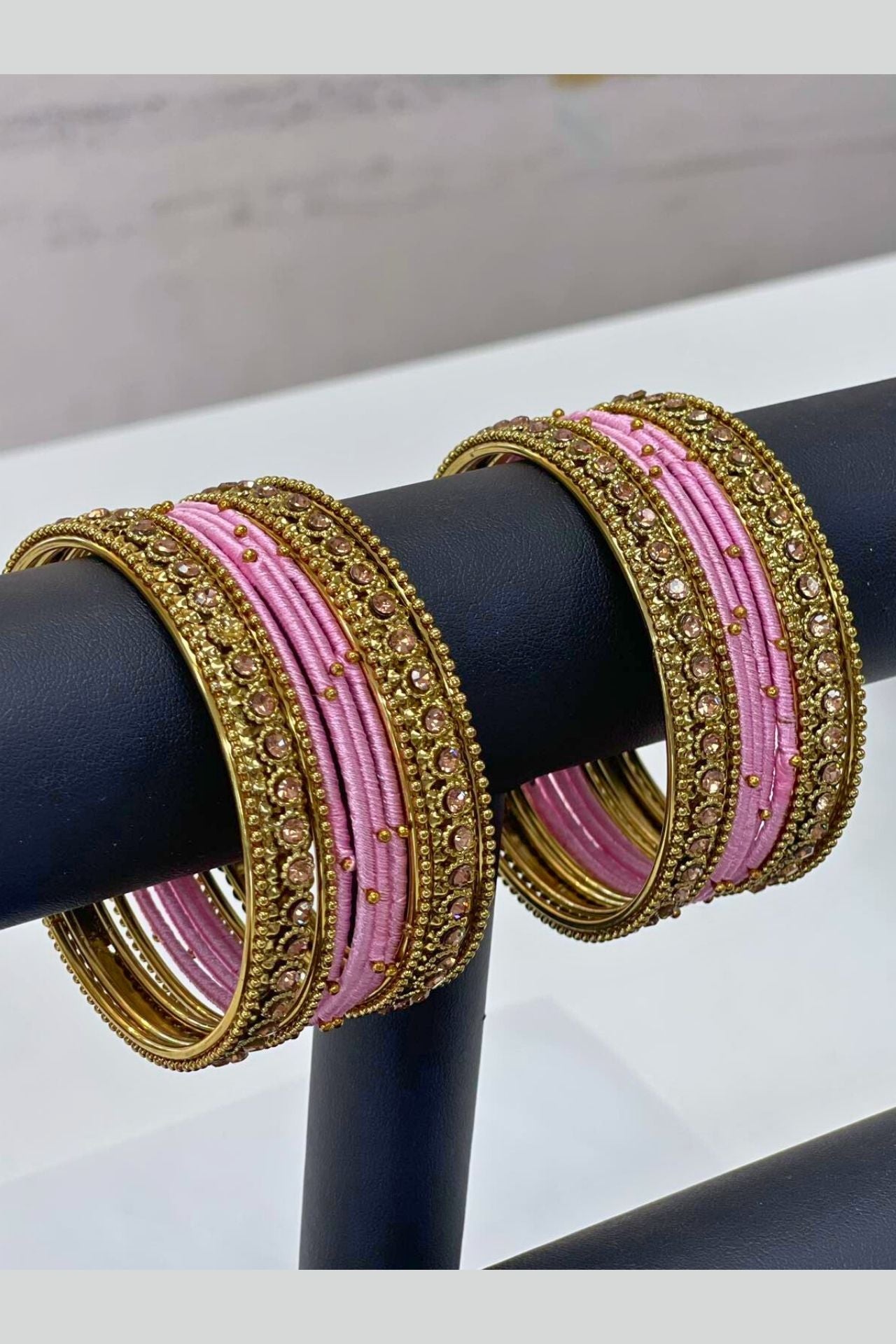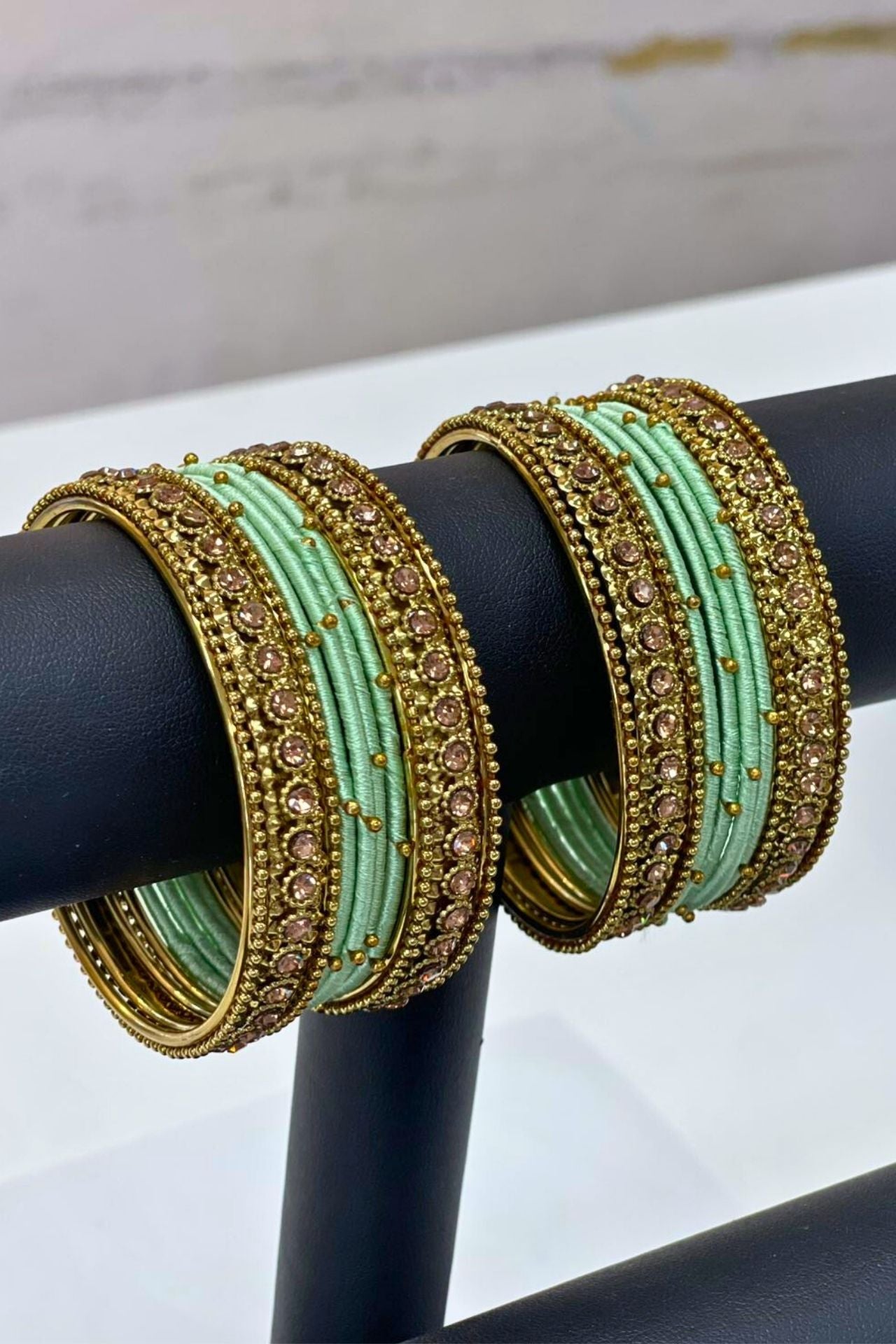 Features a mix of soft silk thread-wrapped bangles accented by ornate gold-plated kadas studded with shimmering champagne stones.