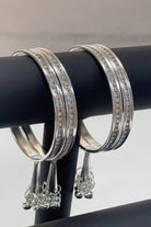 Design: Each bangle features a sleek metallic band inset with a row of iridescent stones, finished with decorative "Latkan" style dangling charms.