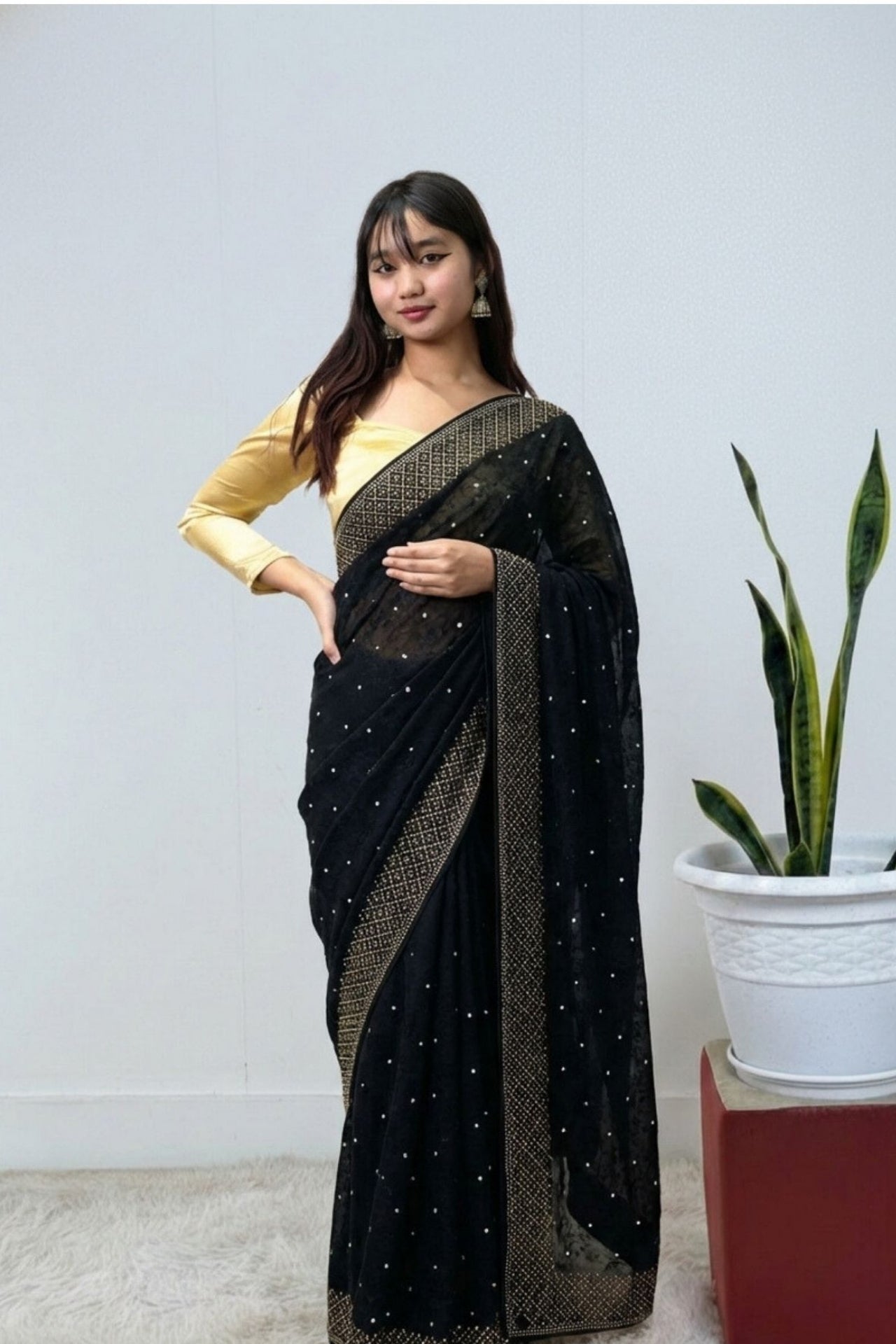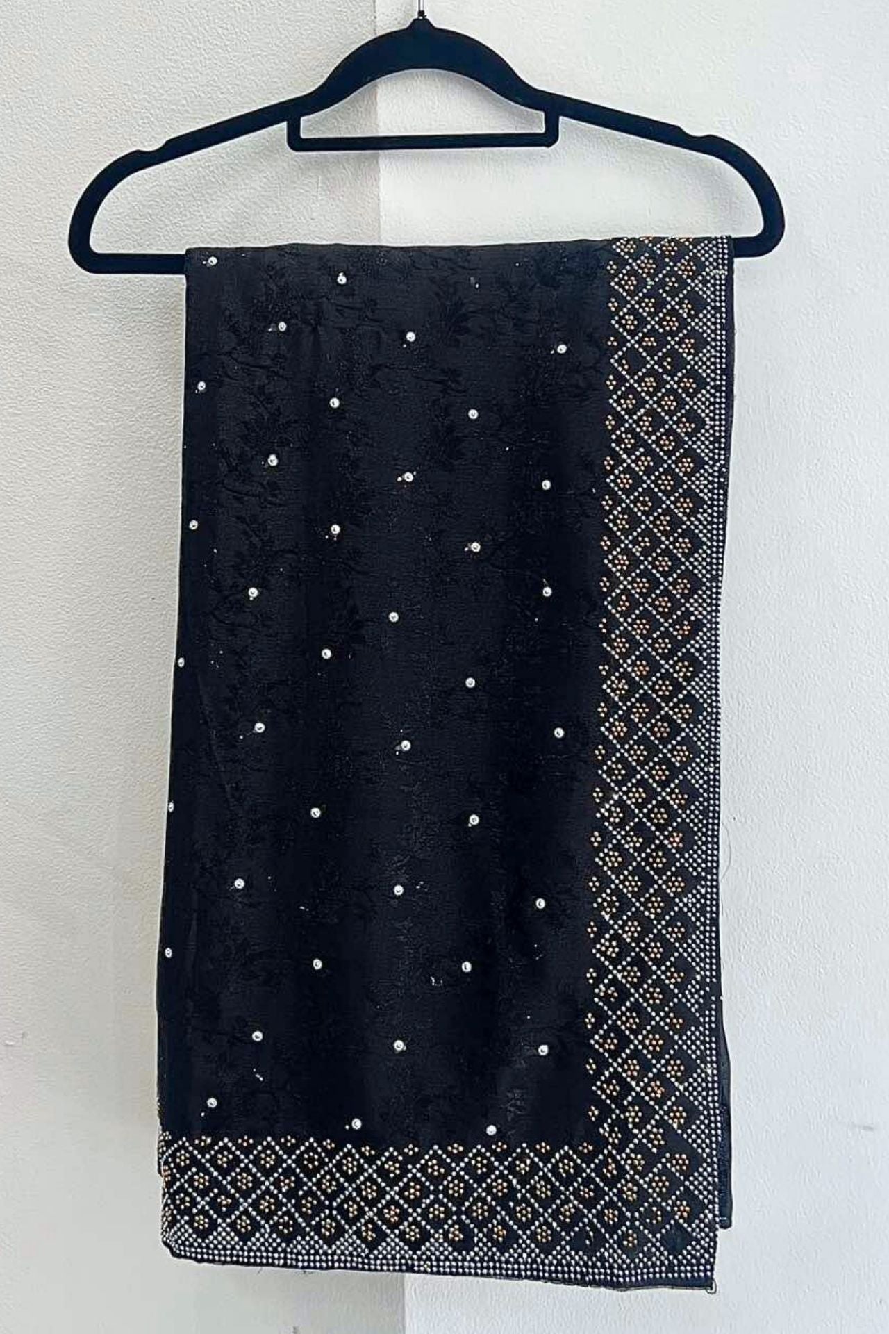 • Features a lightweight, sheer fabric adorned with delicate white stone "butis" and a rich gold-toned border with a geometric diamond-grid pattern.