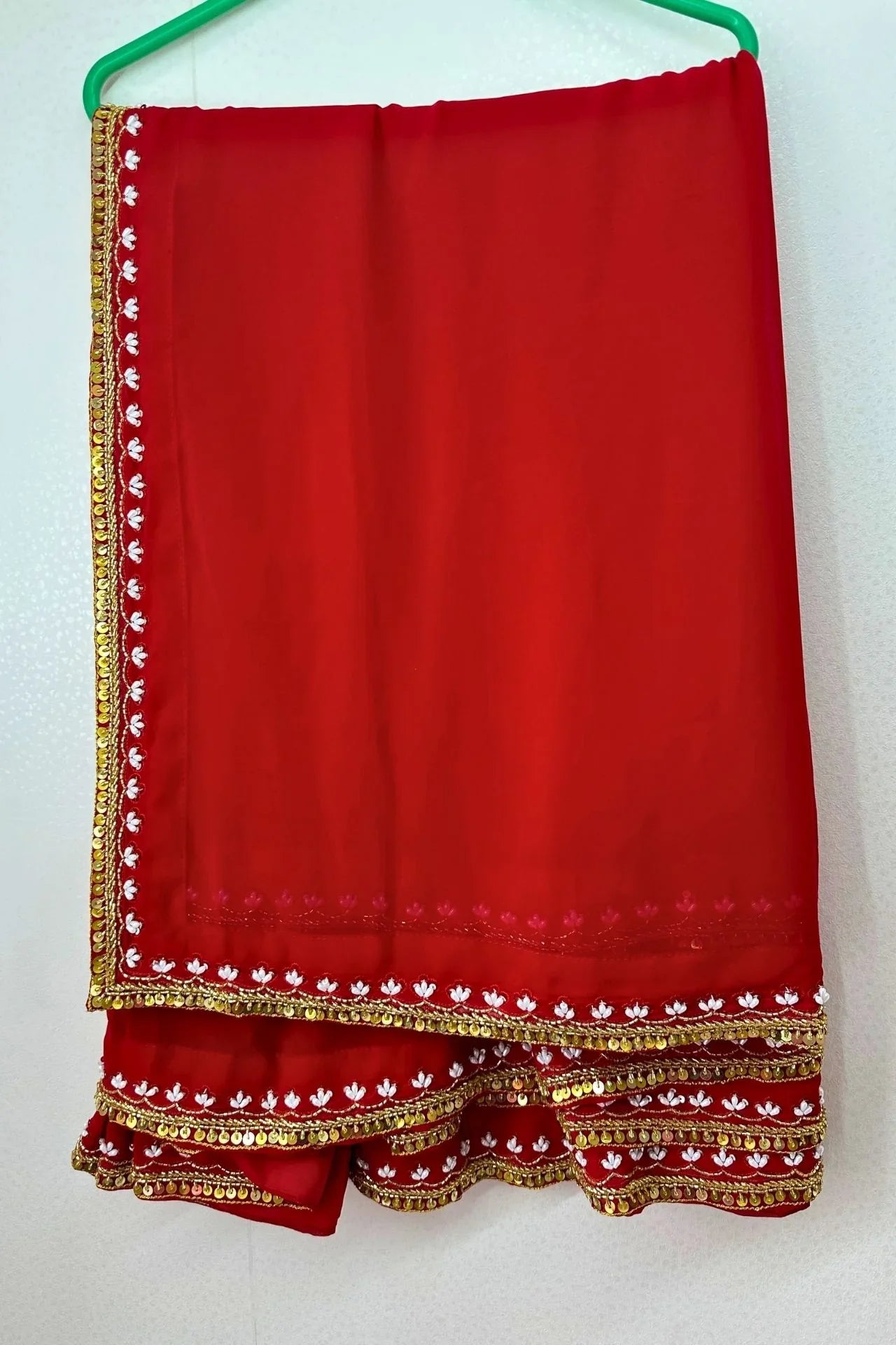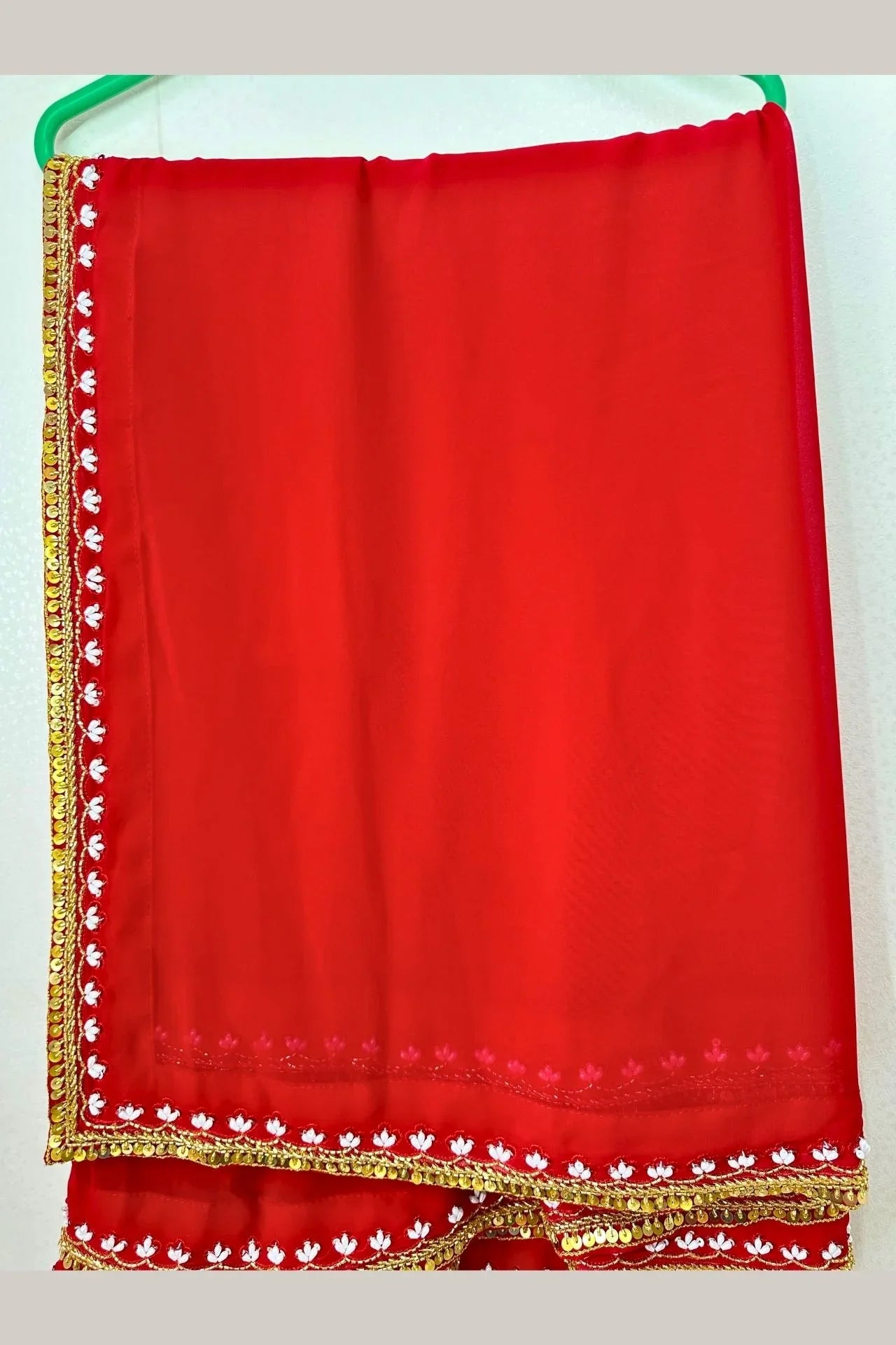 - ✦ Border: Dual-layered border featuring a gold sequin fringe/trim and an inner row of scalloped white and pink thread work.