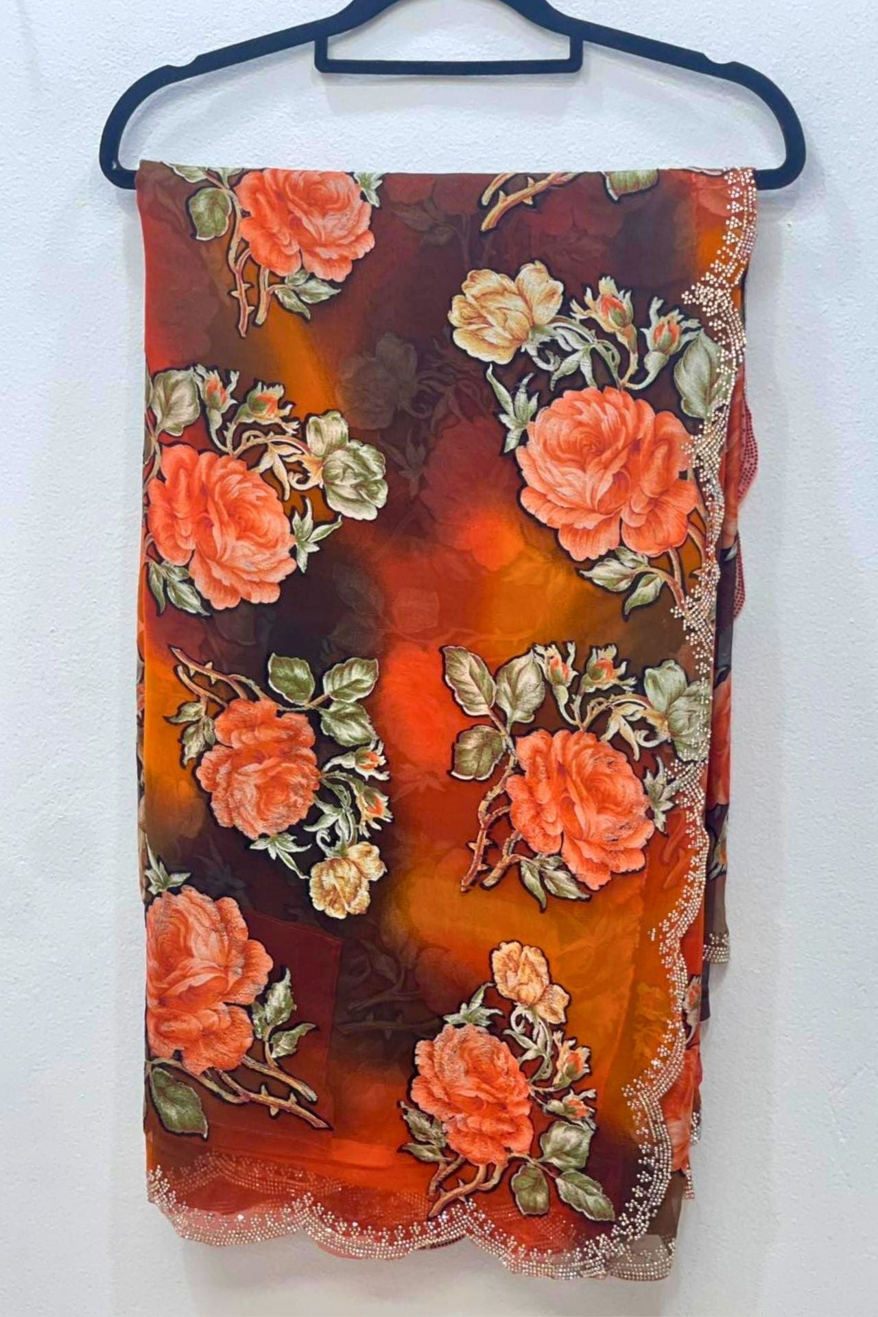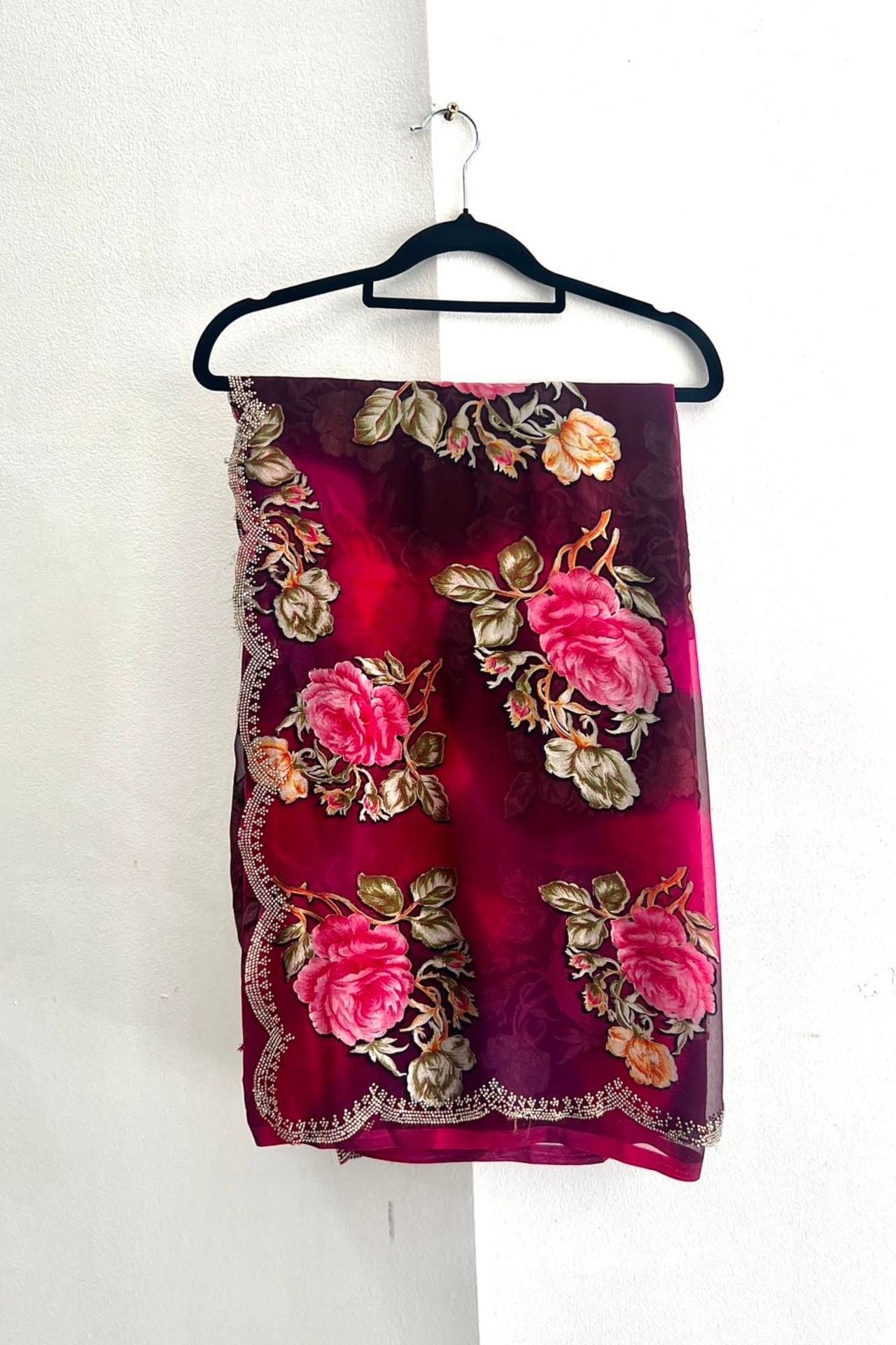 - Large, lush pink rose motifs paired with an intricate, stone-encrusted scalloped border.