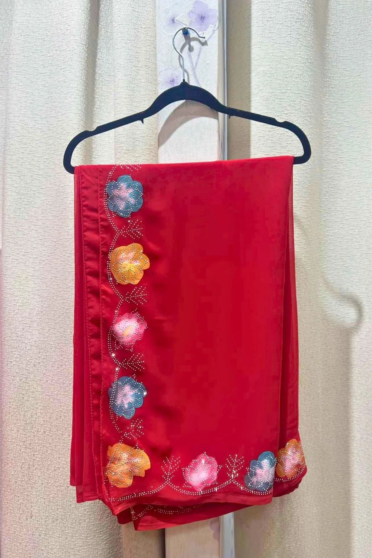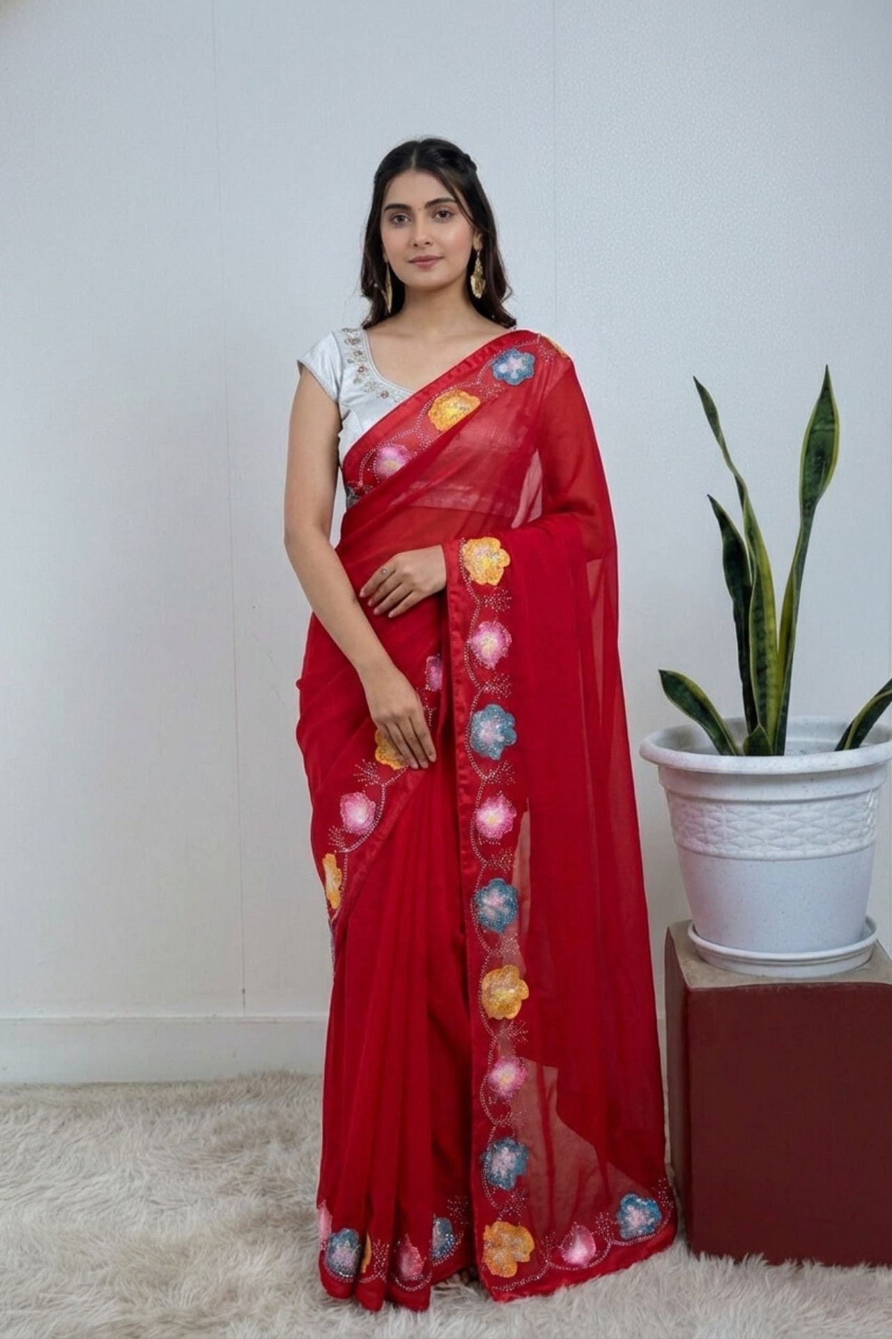 Design: A vibrant red saree with a contemporary and artistic design. The plain, flowing body is beautifully contrasted by large, multi-colored floral motifs and intricate stone detailing along the border.