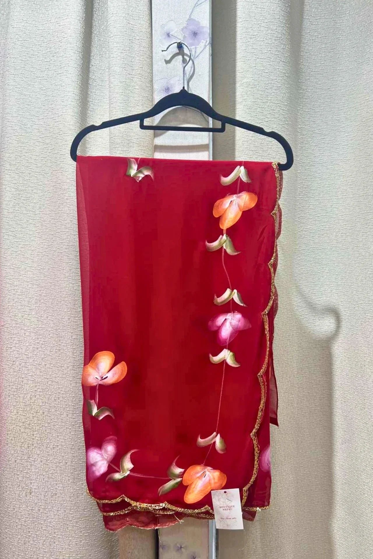 Material: Semi-sheer, lightweight fabric with a gold-trimmed border. The floral motifs appear to be hand-painted.