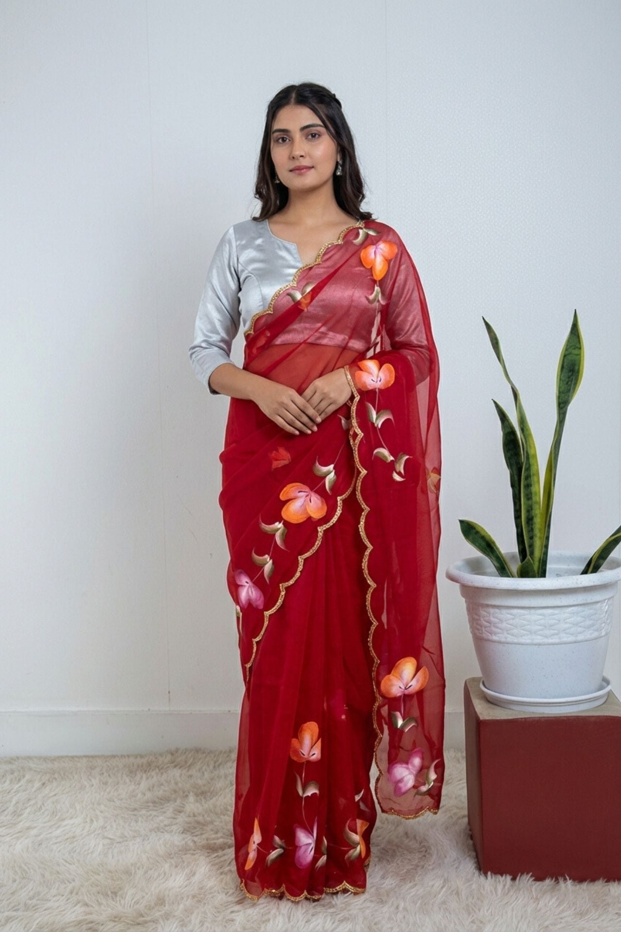 Design: A lightweight saree featuring a bold, hand-painted floral design that cascades down one side. The vibrant orange and pink flowers with green stems stand out against the rich red base, giving it a unique, artistic touch.
