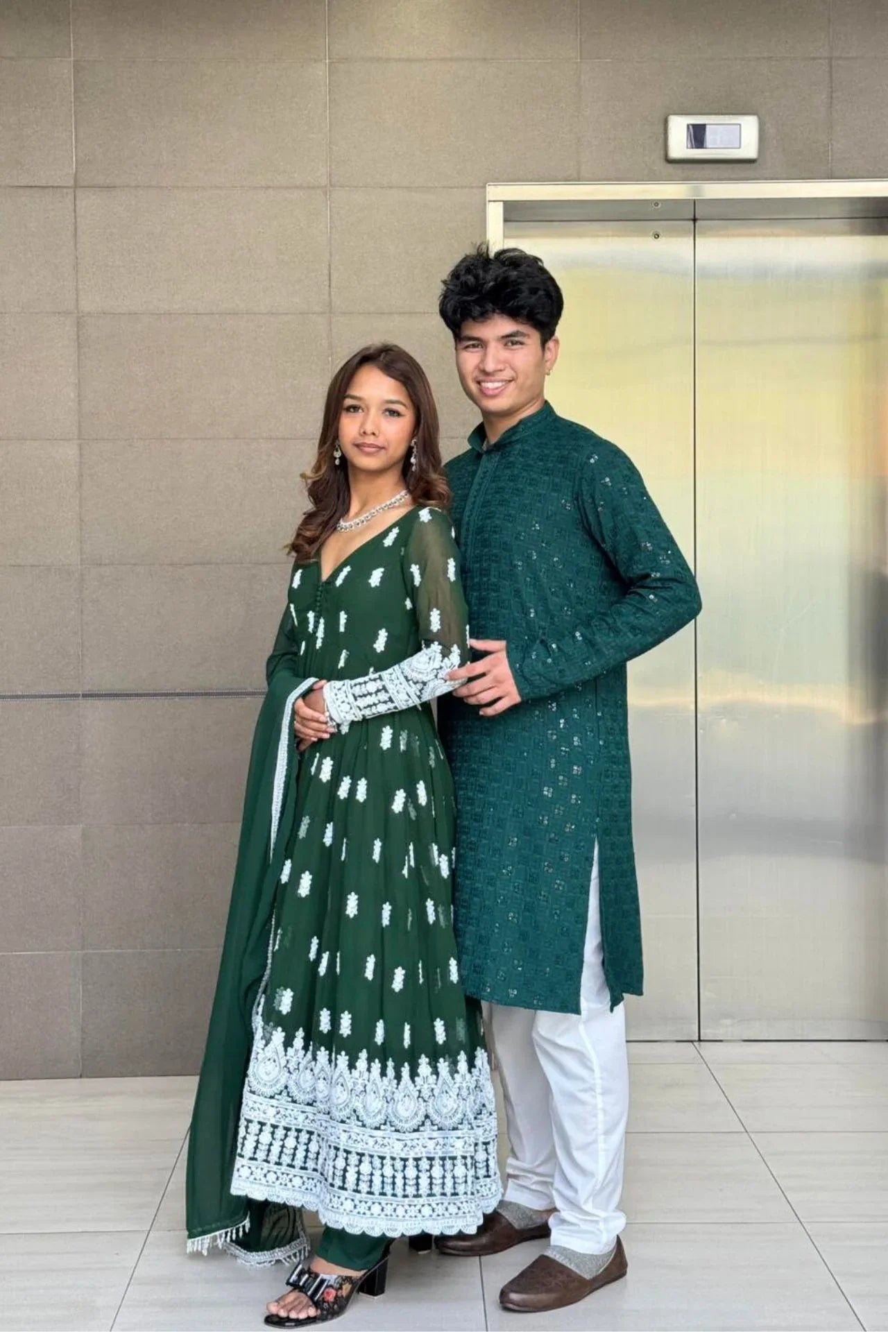- Design : Woman's Outfit: Elegant Anarkali gown-style Kurta with a full, flowing silhouette, paired with matching straight pants and a Dupatta; Man's Outfit: Classic long Kurta with contrast white Pajama. Both feature an all-over patterned texture for a cohesive look.