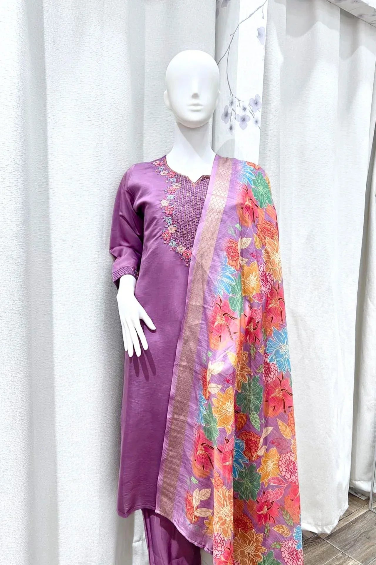 Silk Lavender Kurta Set With Flower Printed Dupatta