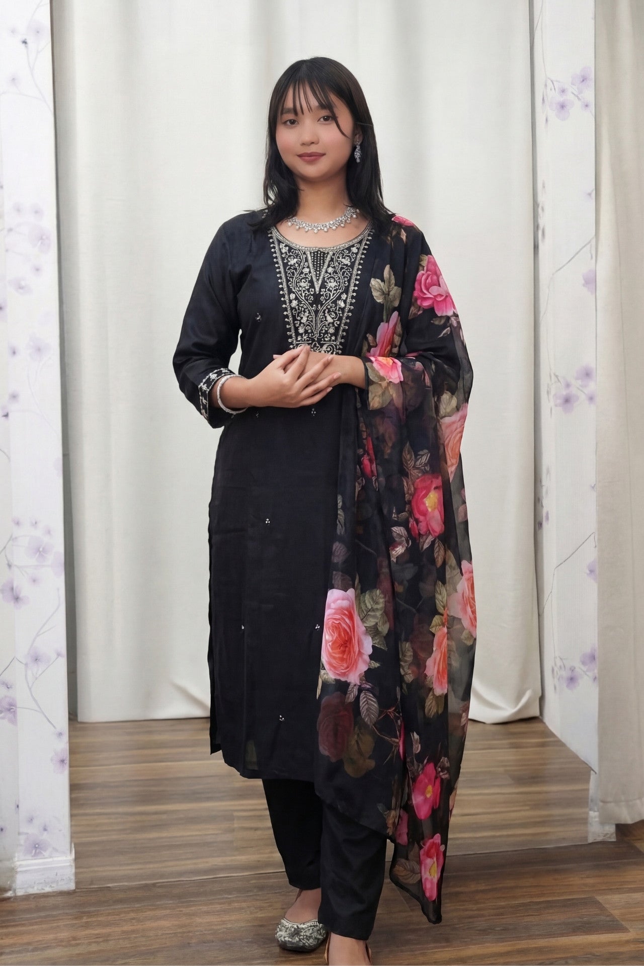 Design: The kurta features elegant silver neckline embroidery and detailed sleeve cuffs. It is paired with a lightweight, flowing dupatta adorned with large, vibrant rose motifs.