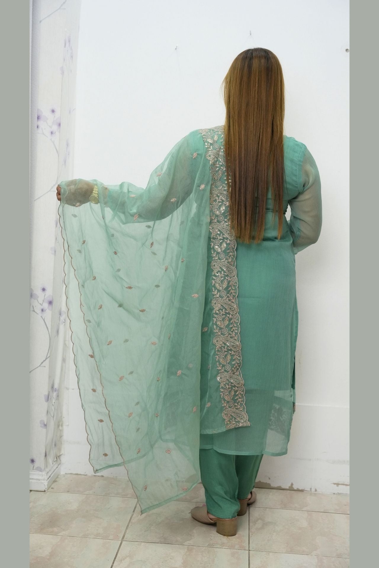 • Color: Refreshing Mint Green with detailed embroidery in soft pink and silver tones.