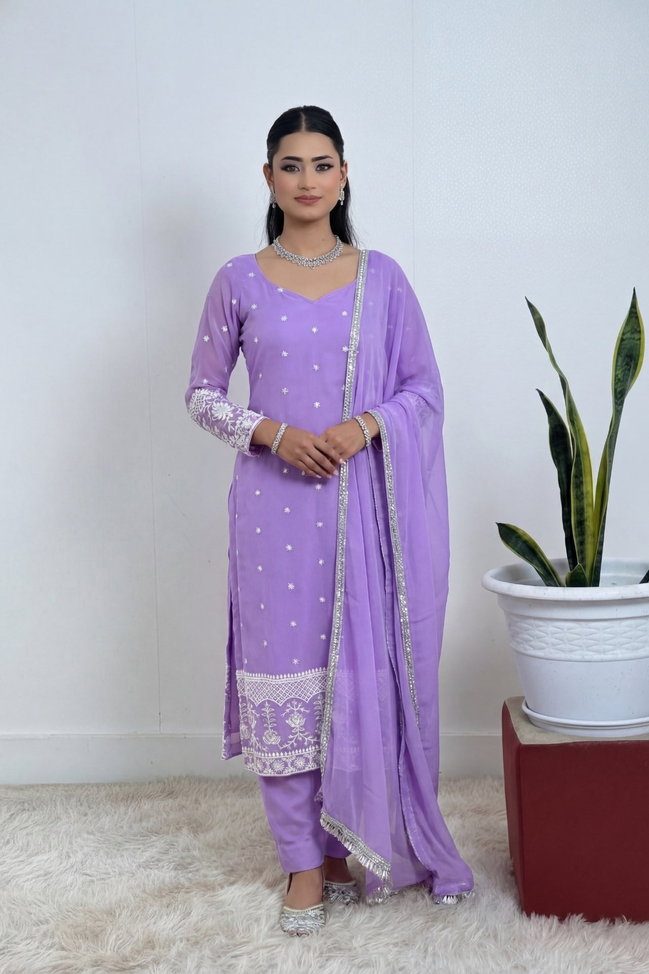 Design: Intricate all-over thread embroidery with a scalloped hemline and matching embroidered dupatta