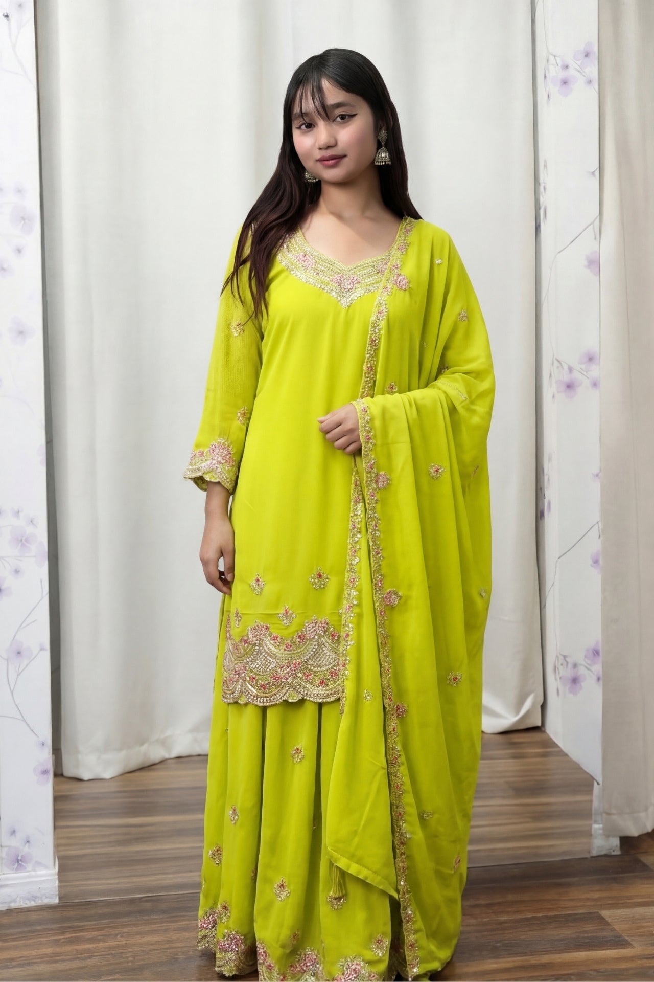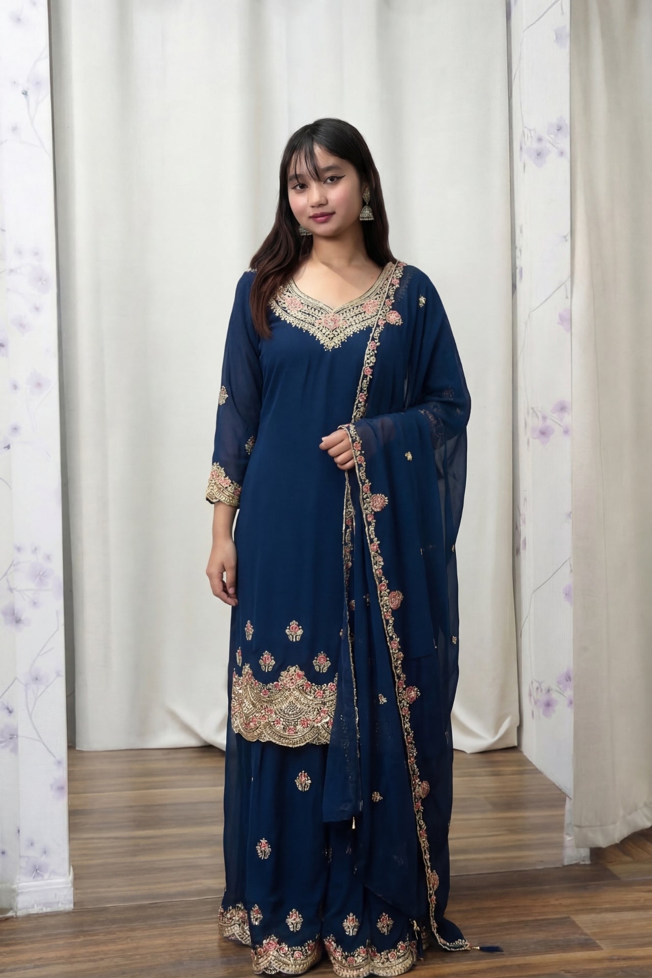 Design: Intricate Zari and thread-work embroidery along the neckline, sleeve cuffs, and tiered hemline.