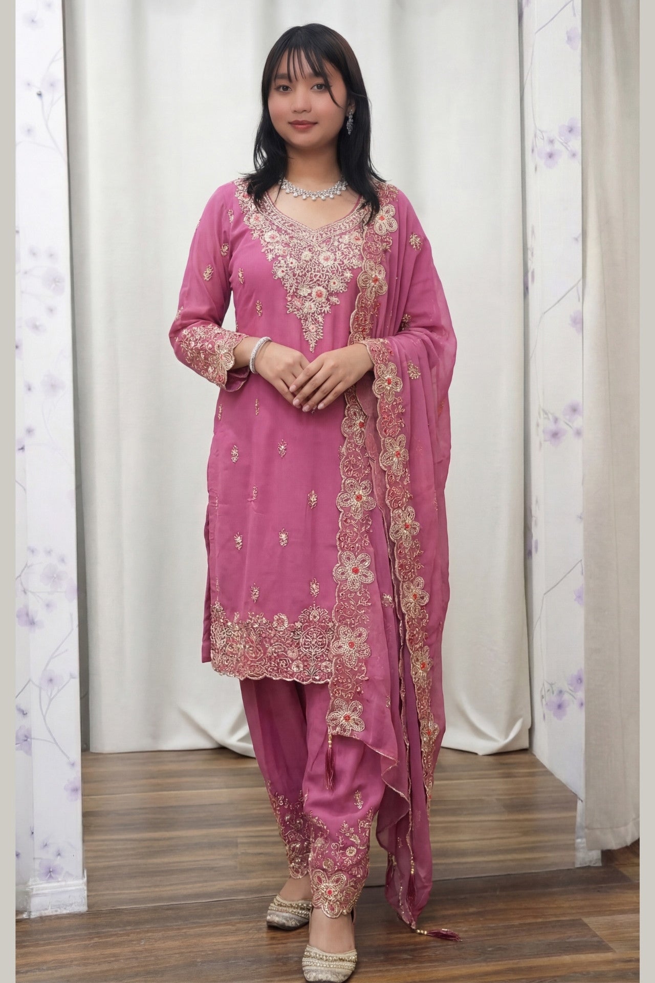 Design: Features heavy floral embroidery on the neckline, hemline, and sleeve cuffs. The set is paired with an ornate scalloped-edge dupatta and matching embroidered salwar pants.