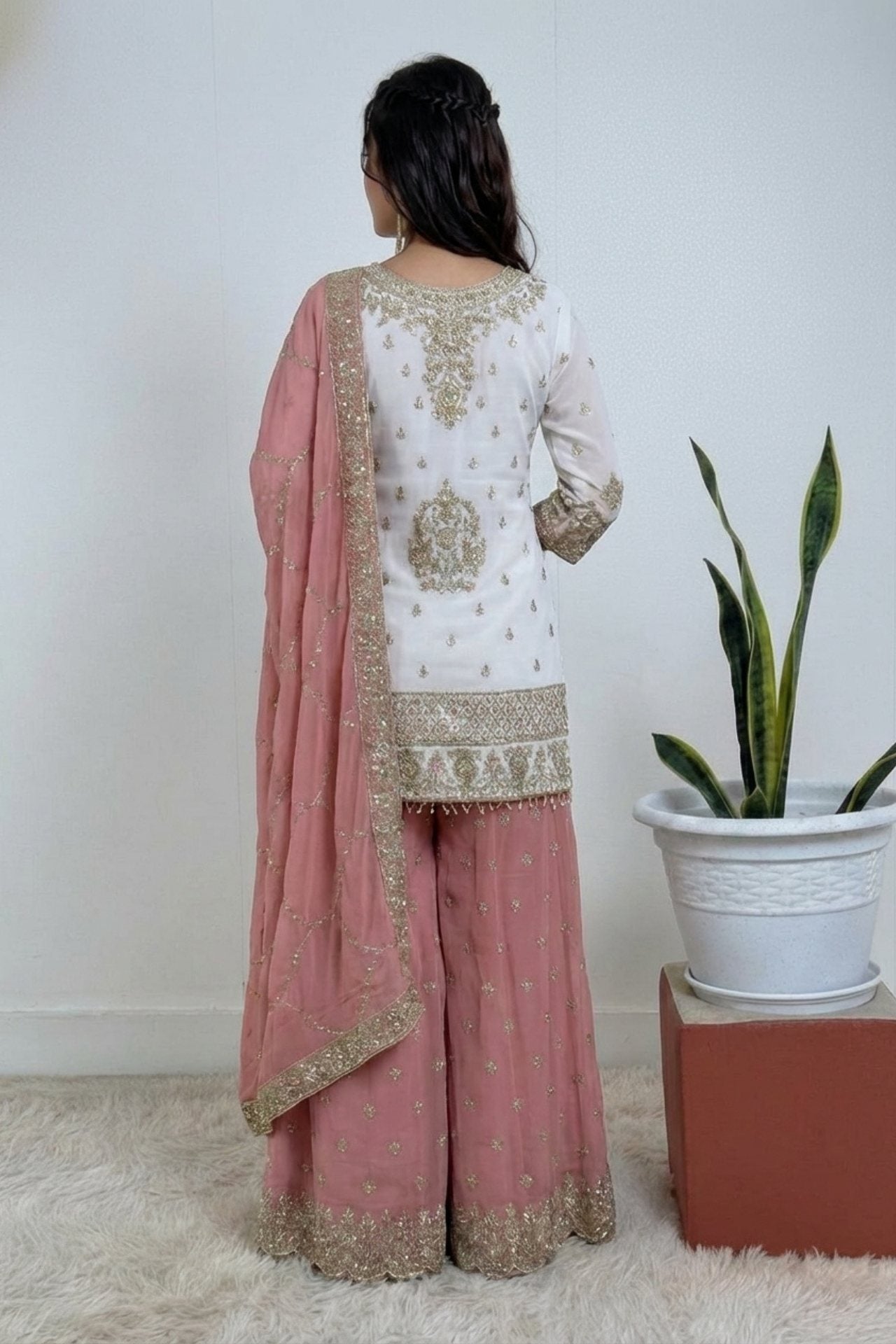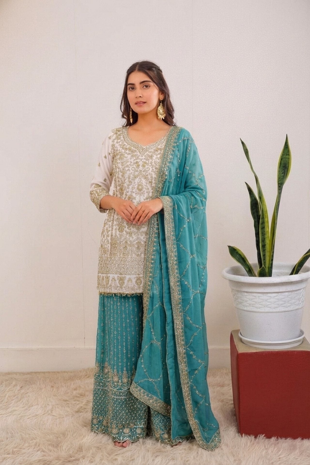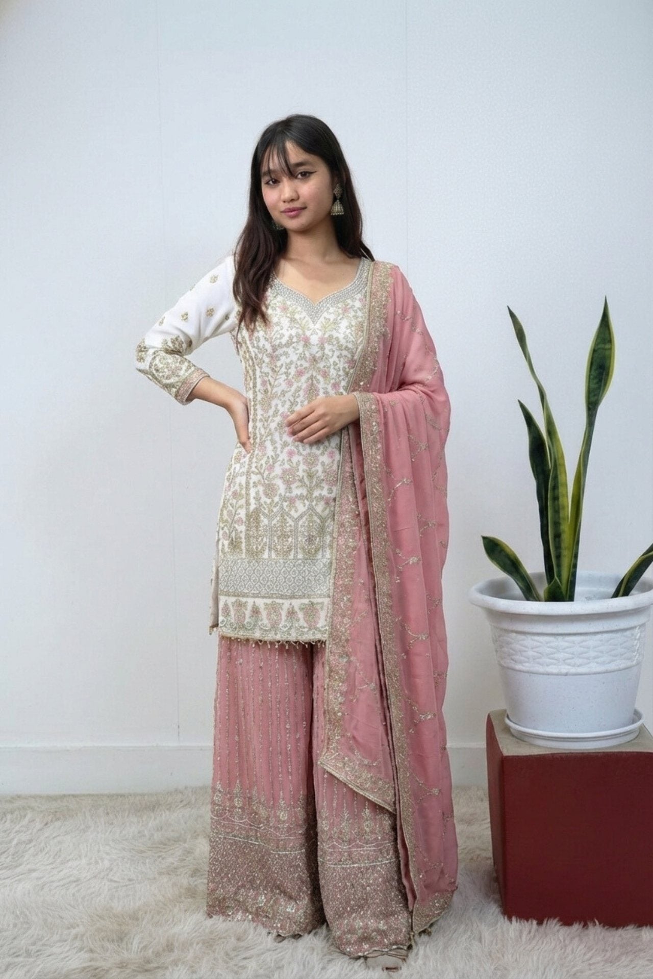 Design: The kurta features intricate golden floral embroidery and sequin work, while the sharara and dupatta boast delicate border detailing and a shimmering finish.