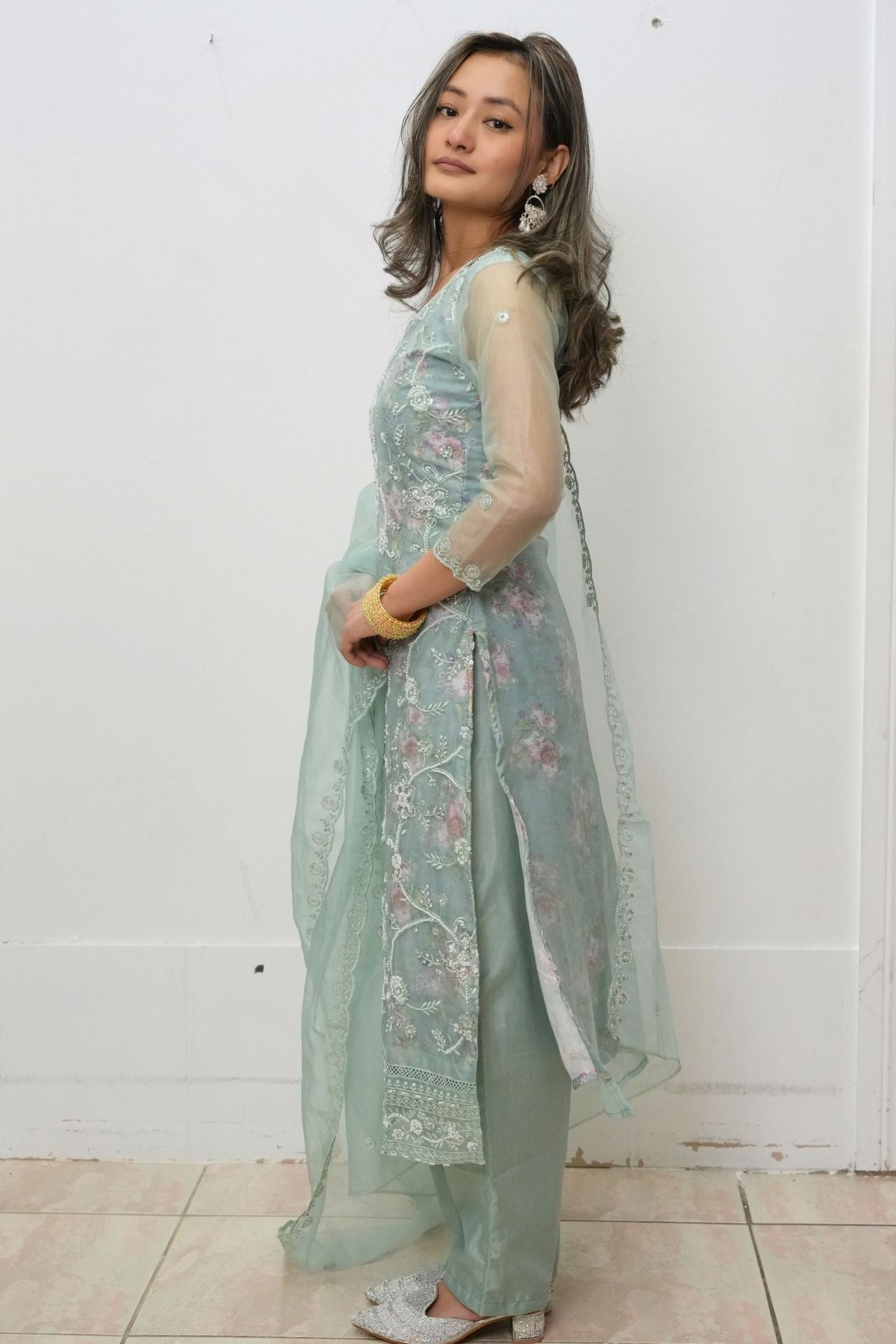 Design: Intricate floral thread and sequin embroidery over sheer Organza fabric on the Kurta and Dupatta.