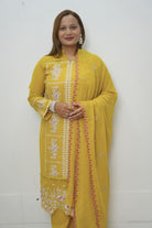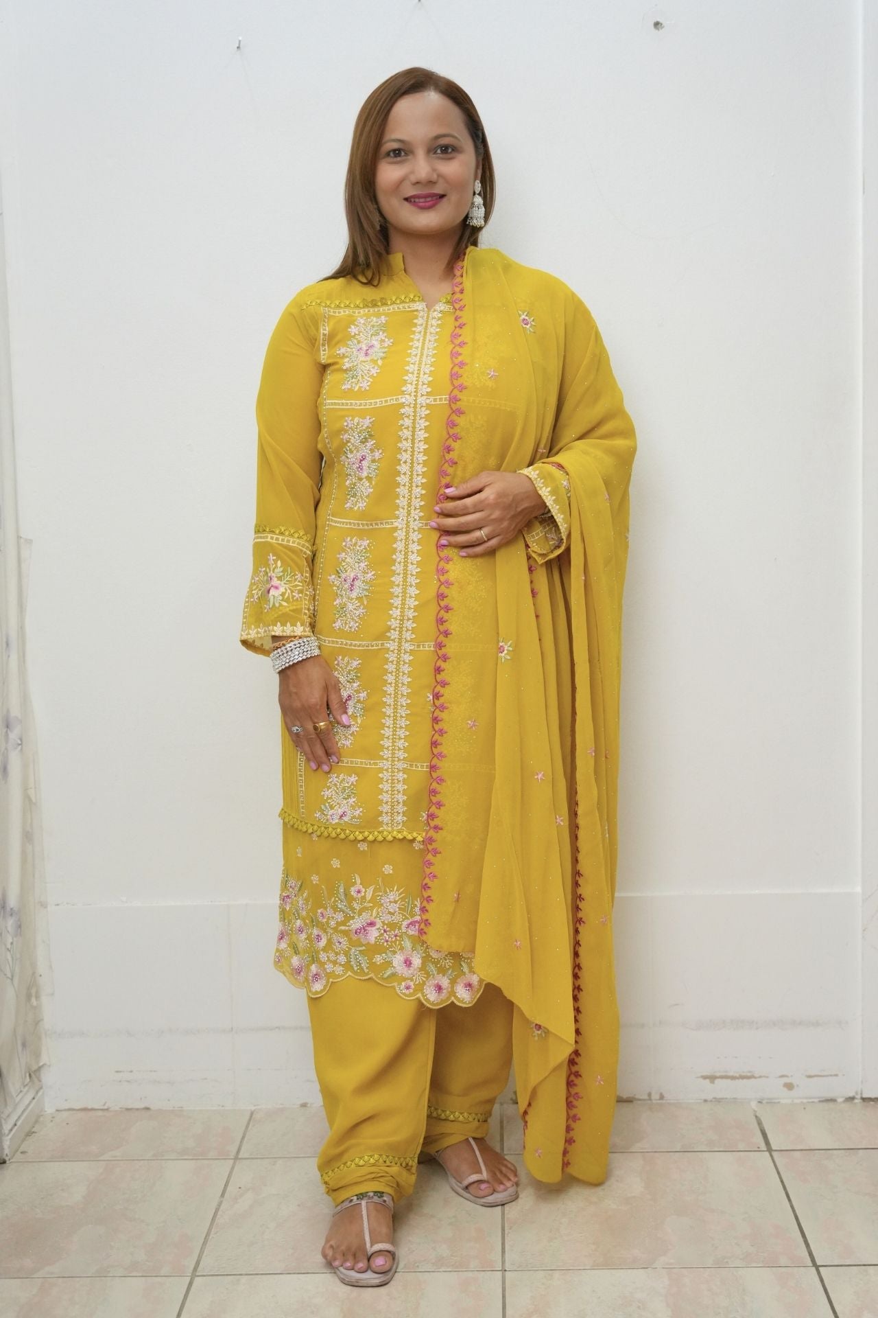 Design: Heavy vertical panel embroidery with floral accents on the Kurta; intricate lace and embroidery detailing on the dupatta.