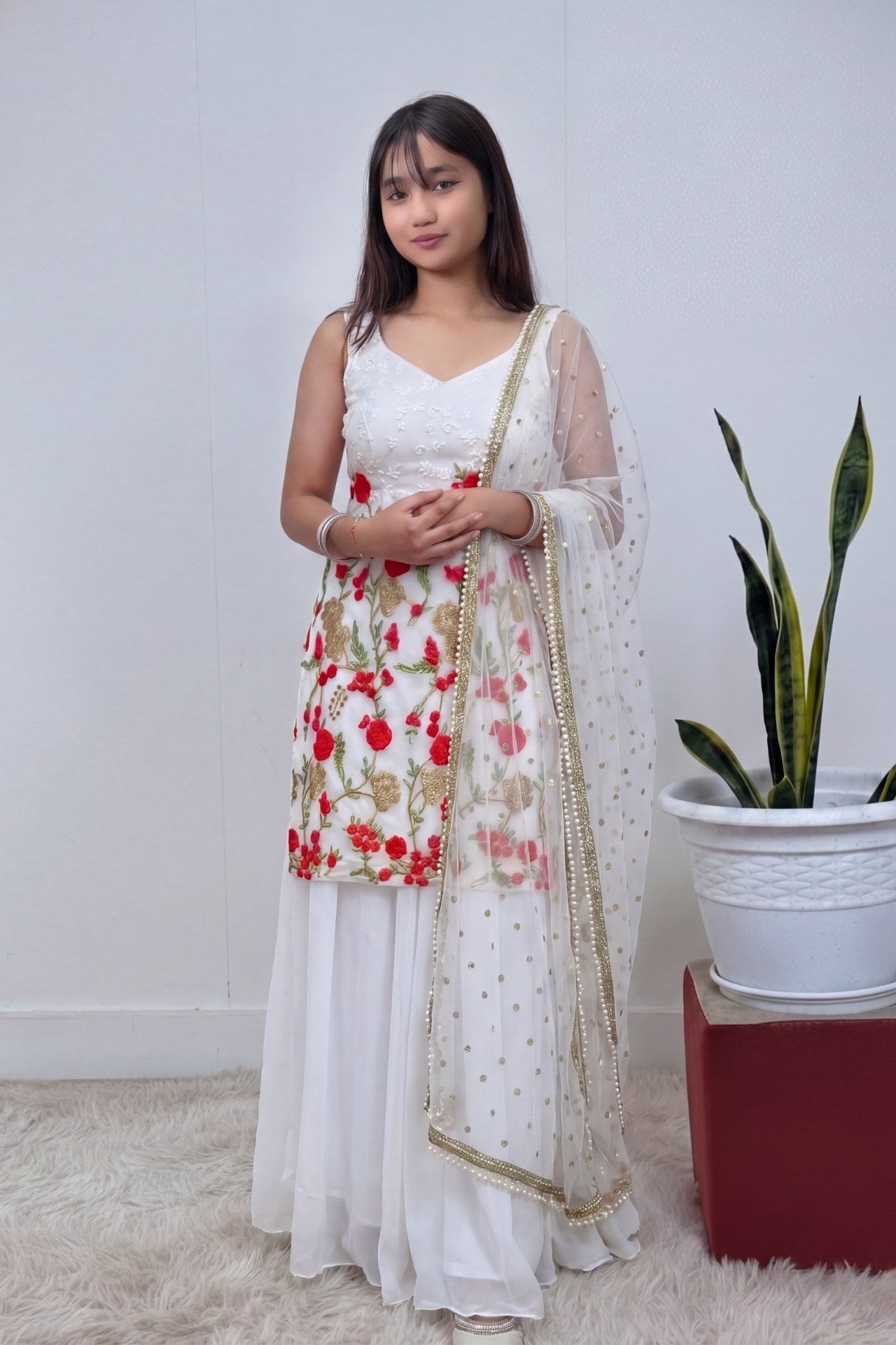 White Kurti Plazo Floral Design