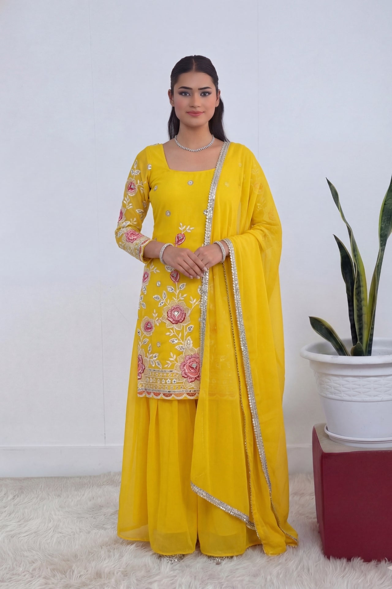 Yellow Kurti Plazo Thread Work