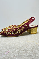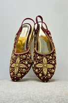 - Crafted from rich, deep maroon velvet, the closed toe is exquisitely adorned with intricate gold and silver-toned beadwork forming a beautiful central floral motif.